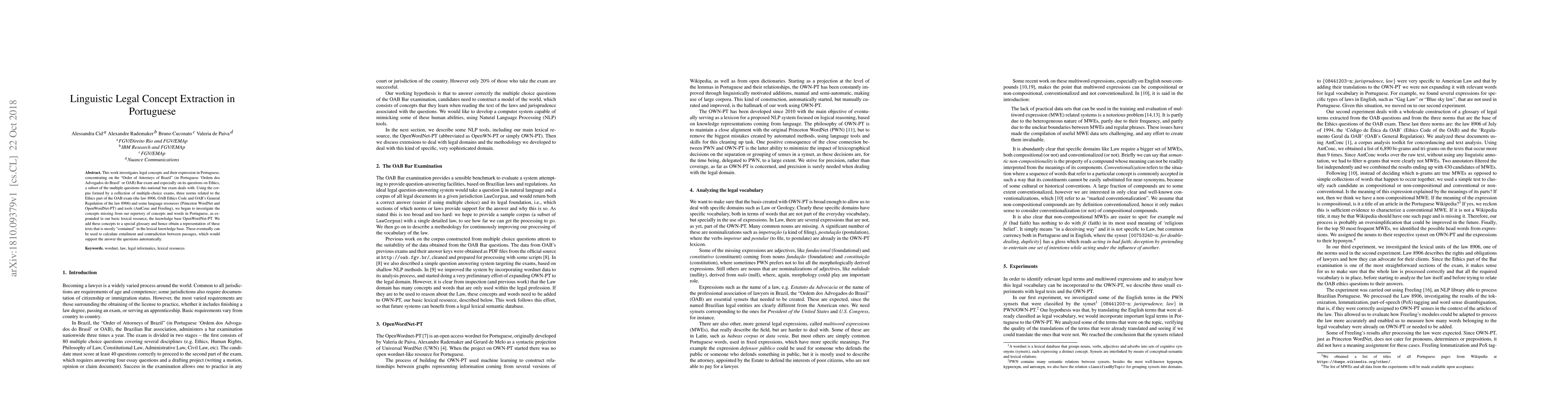 This work investigates legal concepts and their expression in Portuguese, concentrating on the "Order of Attorneys of Brazil" Bar exam. Using a corpus formed by a collection of multiple-choice questions, three norms related to the Ethics part of the OAB exam, language resources (Princeton WordNet and OpenWordNet-PT) and tools (AntConc and Freeling), we began to investigate the concepts and words missing from our repertory of concepts and words in Portuguese, the knowledge base OpenWordNet-PT. We add these concepts and words to OpenWordNet-PT and hence obtain a representation of these texts that is "contained" in the lexical knowledge base.
