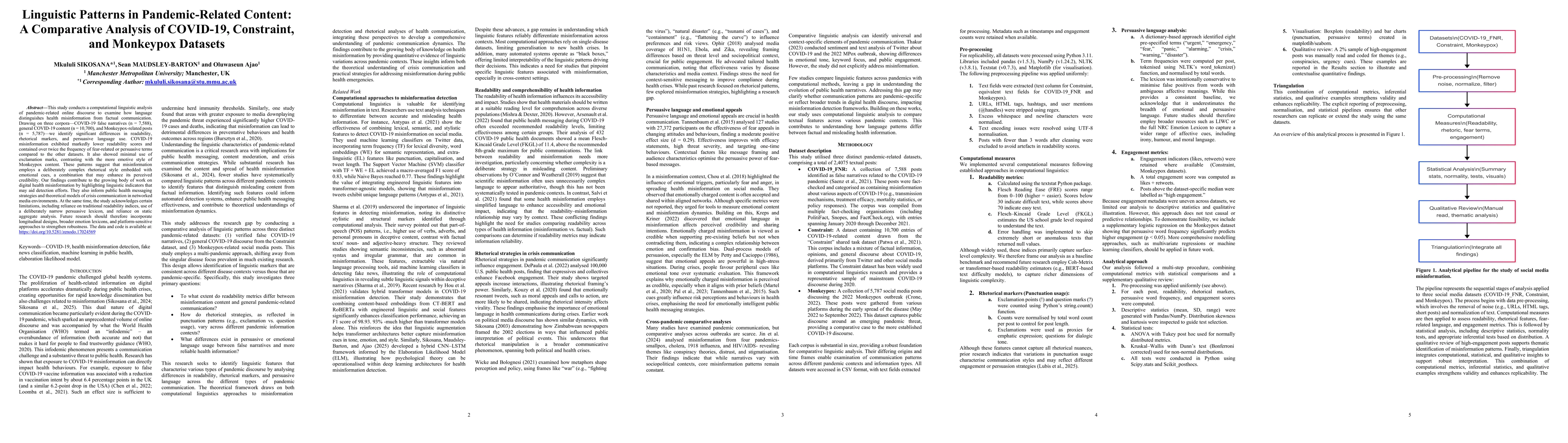 The study employed a comparative linguistic analysis of three datasets: COVID-19 misinformation, general Twitter discourse, and Monkeypox outbreak posts. It used readability metrics, emotional lexicons, and thematic content analysis to identify linguistic patterns and engagement differences.