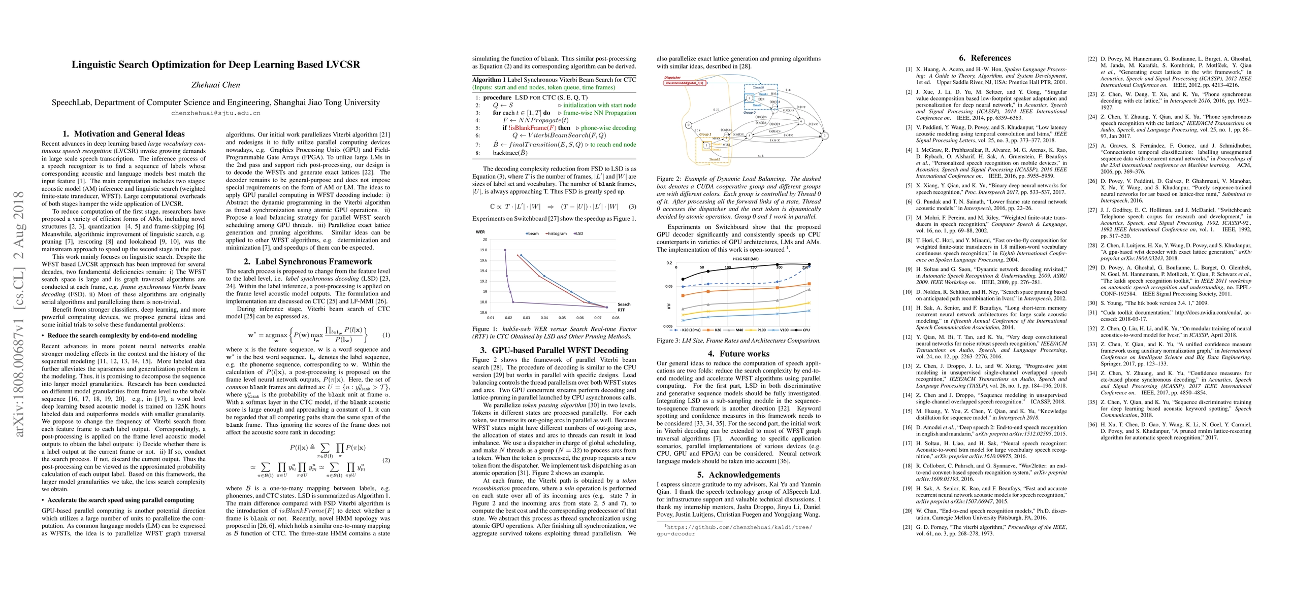 Recent advances in deep learning based large vocabulary con- tinuous speech recognition (LVCSR) invoke growing demands in large scale speech transcription. The inference process of a speech recognizer is to find a sequence of labels whose corresponding acoustic and language models best match the input feature [1]. The main computation includes two stages: acoustic model (AM) inference and linguistic search (weighted finite-state transducer, WFST). Large computational overheads of both stages hamper the wide application of LVCSR. Benefit from stronger classifiers, deep learning, and more powerful computing devices, we propose general ideas and some initial trials to solve these fundamental problems.