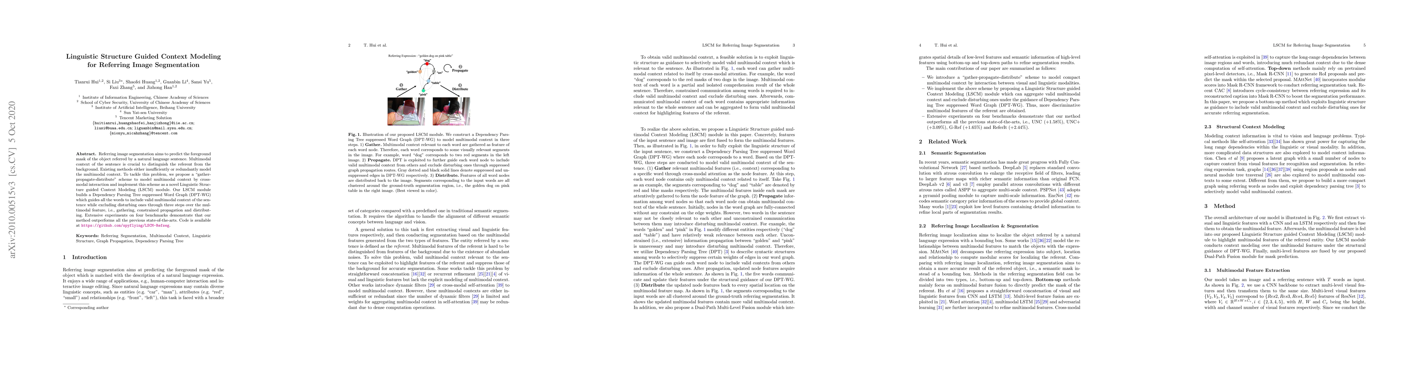 The paper proposes a "gather-propagate-distribute" scheme called Linguistic Structure guided Context Modeling (LSCM) to improve referring image segmentation by effectively modeling multimodal context. The LSCM module uses a Dependency Parsing Tree suppressed Word Graph to incorporate relevant context while excluding irrelevant information, outperforming previous methods on four benchmarks.