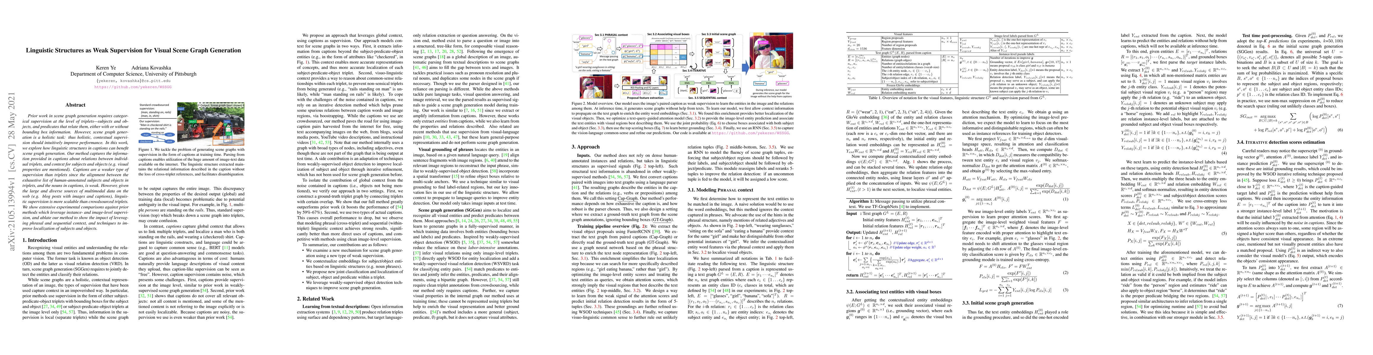 This paper investigates using linguistic structures from captions as weak supervision to enhance visual scene graph generation, demonstrating that linguistic context can provide scalable, albeit less precise, guidance compared to categorical triplet supervision. Experimental results show improved performance when incorporating phrasal and sequential context from captions.