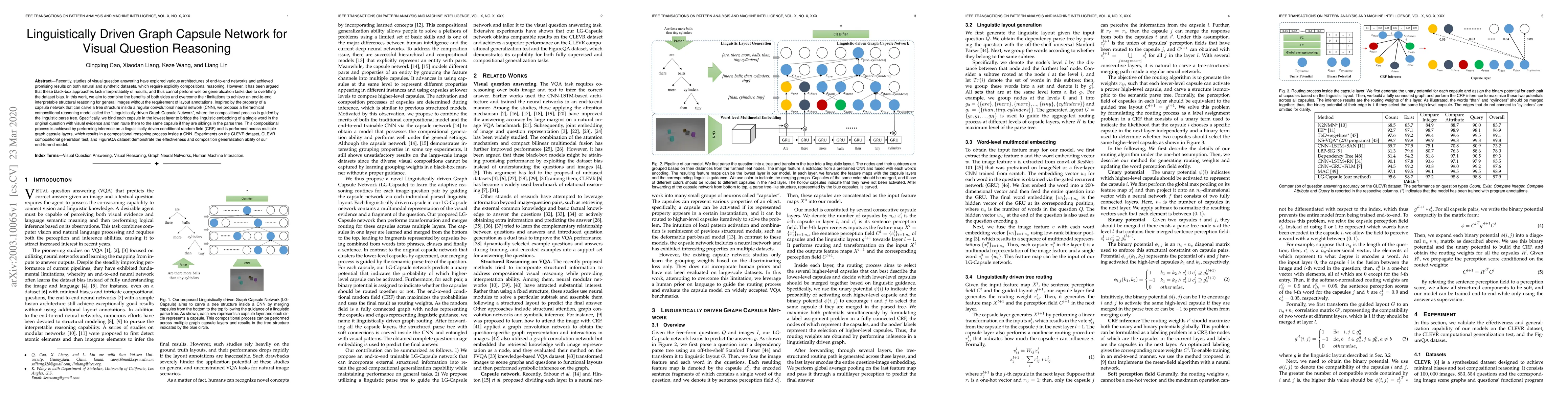 This paper proposes a "Linguistically driven Graph Capsule Network" for visual question answering, combining capsule networks with linguistic parse trees to achieve interpretable, compositional reasoning. Experiments on multiple datasets show its effectiveness and generalization capability.