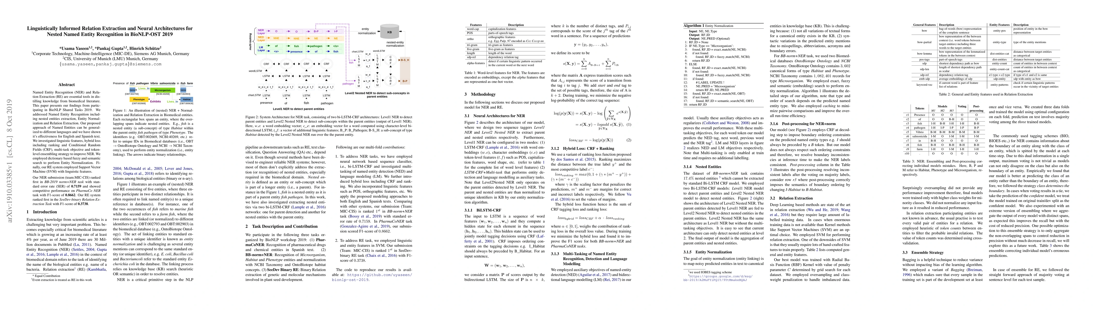 This paper presents an advanced approach for Named Entity Recognition (NER) and Relation Extraction (RE) in biomedical literature, achieving top rankings in BioNLP-OST 2019 tasks. The NER system, utilizing linguistic features and multi-task learning, excelled in nested entity extraction and was effective across English and Spanish texts.