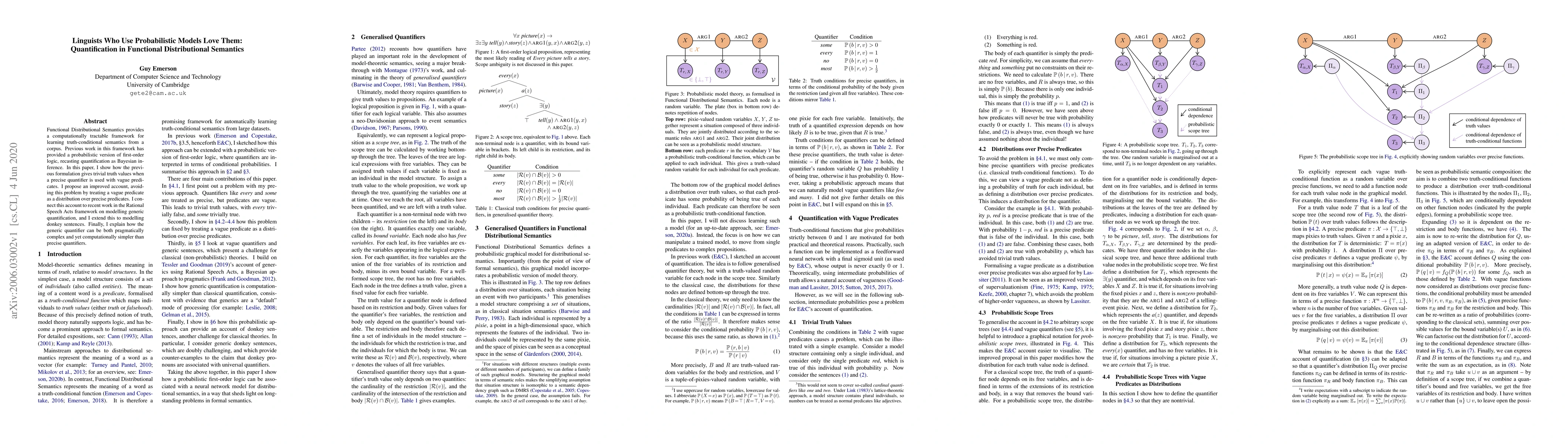Functional Distributional Semantics provides a computationally tractable framework for learning truth-conditional semantics from a corpus. Previous work in this framework has provided a probabilistic version of first-order logic, recasting quantification as Bayesian inference. In this paper, I show how the previous formulation gives trivial truth values when a precise quantifier is used with vague predicates. I propose an improved account, avoiding this problem by treating a vague predicate as a distribution over precise predicates. I connect this account to recent work in the Rational Speech Acts framework on modelling generic quantification, and I extend this to modelling donkey sentences. Finally, I explain how the generic quantifier can be both pragmatically complex and yet computationally simpler than precise quantifiers.
