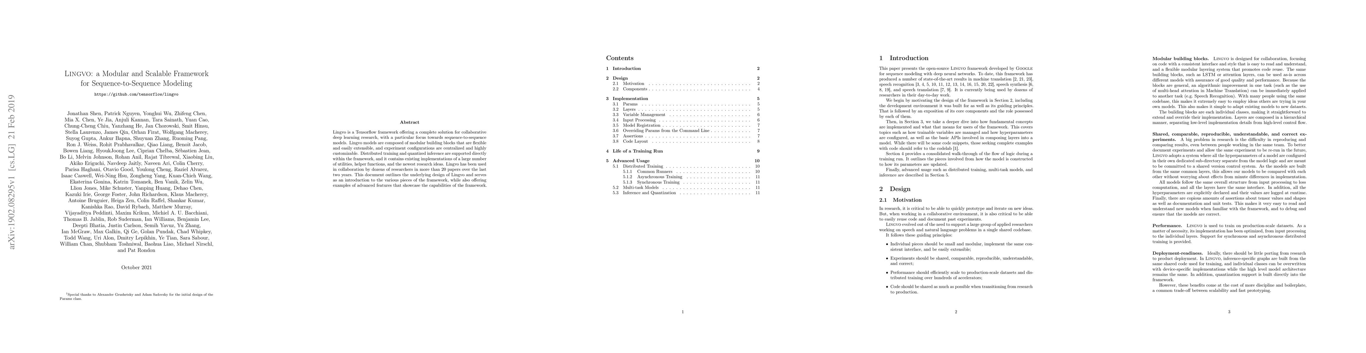 Lingvo is a modular framework for sequence-to-sequence modeling that supports distributed training, quantized inference, and customizable experiment configurations, enabling collaborative deep learning research.