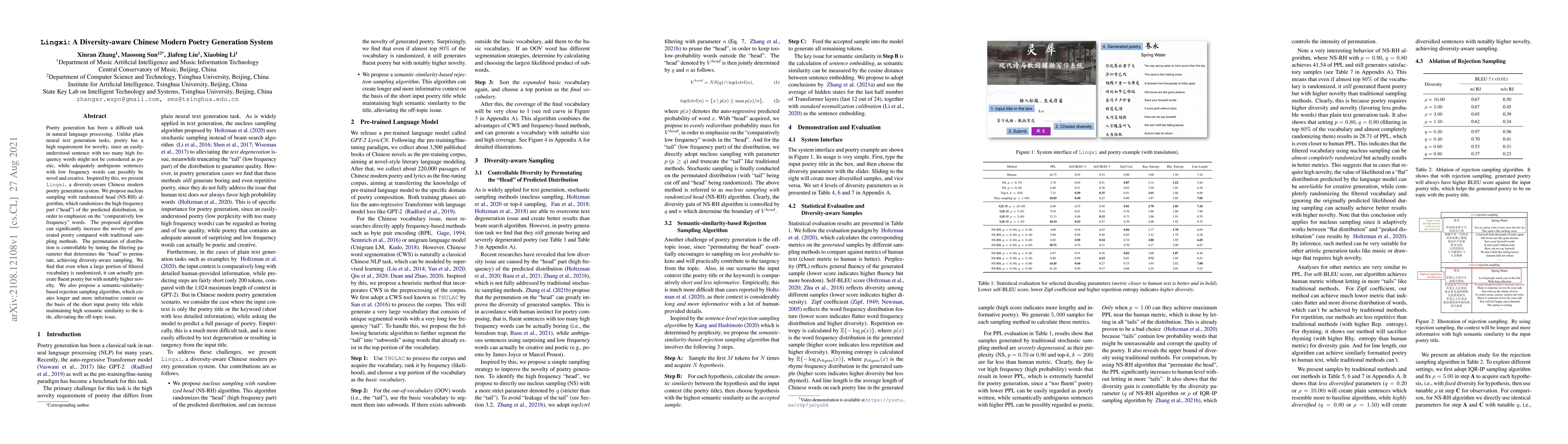 Lingxi is a diversity-aware Chinese modern poetry generation system that employs a nucleus sampling with randomized head (NS-RH) algorithm to enhance novelty by prioritizing low-frequency words. It also uses semantic-similarity-based rejection sampling to maintain context relevance while generating poetic content.
