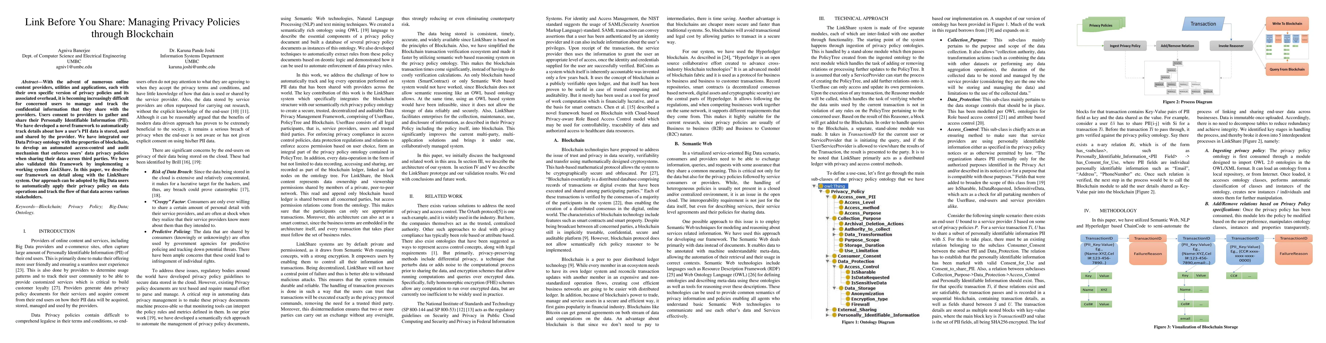 This paper introduces a blockchain-based framework to automatically manage and enforce users' privacy policies across various online providers, ensuring transparent tracking of Personal Identifiable Information (PII) usage and sharing. A working system, LinkShare, validates this approach, offering a solution for big data users to automate privacy policy application and data flow monitoring.