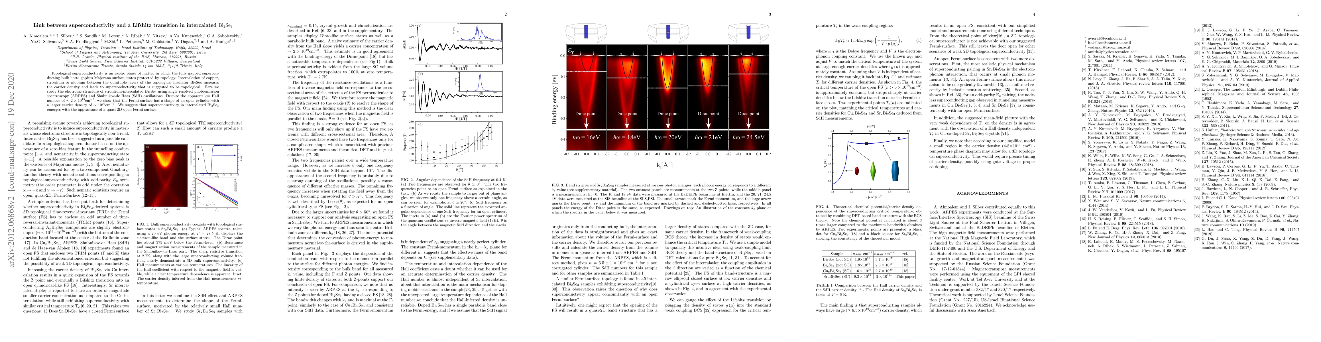 This research investigates the superconductivity in intercalated Bi$_2$Se$_3$ through ARPES and SdH oscillations, finding an open cylindrical Fermi surface with a higher carrier density, suggesting the superconductivity emerges linked to a Lifshitz transition. The study supports the possibility of topological superconductivity in these materials.