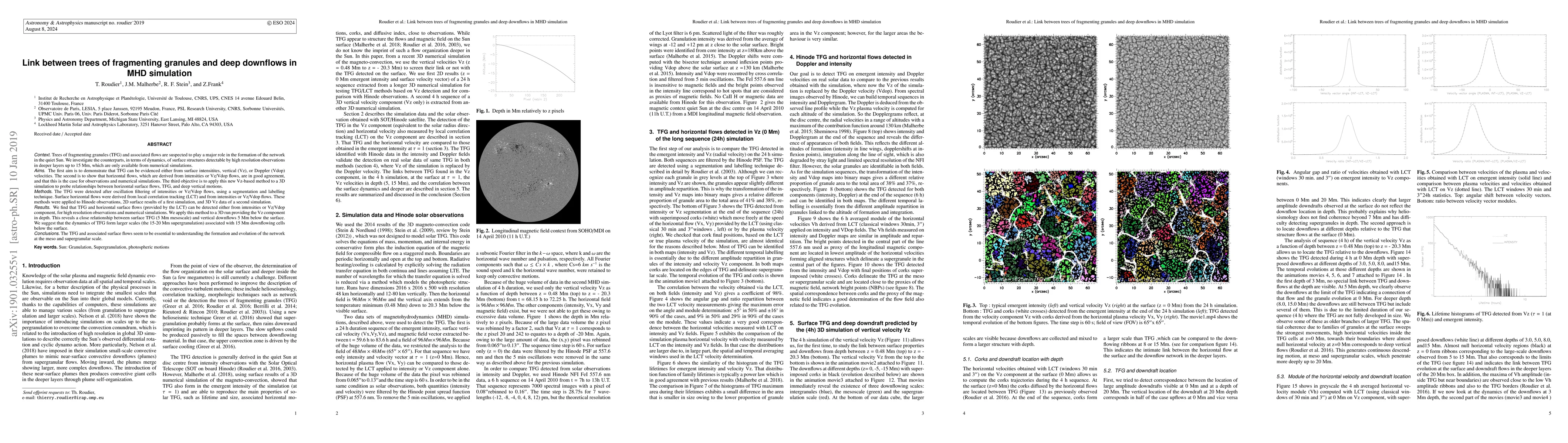 Trees of fragmenting granules (TFG) and associated flows are suspected to playa major role in the formation of the network in the quiet Sun. We investigate the counterparts, in terms of dynamics, of surface structures detectable by high resolution observations in deeper layers up to 15 Mm, which are only available from numerical simulations. The first aim is to demonstrate that TFG can be evidenced either from surface intensitites, vertical (Vz), or Doppler (Vdop) velocities. The second is to show that horizontal flows, which are derived from intensities or Vz/Vdop flows, are in good agreement, and that this is the case for observations and numerical simulations. The third objective is to apply this new Vz-based method to a 3D simulation to probe relationships between horizontal surface flows, TFG, and deep vertical motions. The TFG were detected after oscillation filtering of intensities or Vz/Vdop flows, using a segmentation and labelling technique. Surface horizontal flows were derived from local correlation tracking (LCT) and from intensities or Vz/Vdop flows. These methods were applied to Hinode observations, 2D surface results of a first simulation, and 3D Vz data of a second simulation. We find that TFG and horizontal surface flows (provided by the LCT) can be detected either from intensities or Vz/Vdop component, for high resolution observations and numerical simulations. We apply this method to a 3D run providing the Vz component in depth. This reveals a close relationship between surface TFG (5 Mm mesoscale) and vertical downflows 5 Mm below the surface. We suggest that the dynamics of TFG form larger scales (the 15-20 Mm supergranulation) associated with 15 Mm downflowing cells below the surface. The TFG and associated surface flows seem to be essential to understanding the formation and evolution of the network at the meso and supergranular scale.