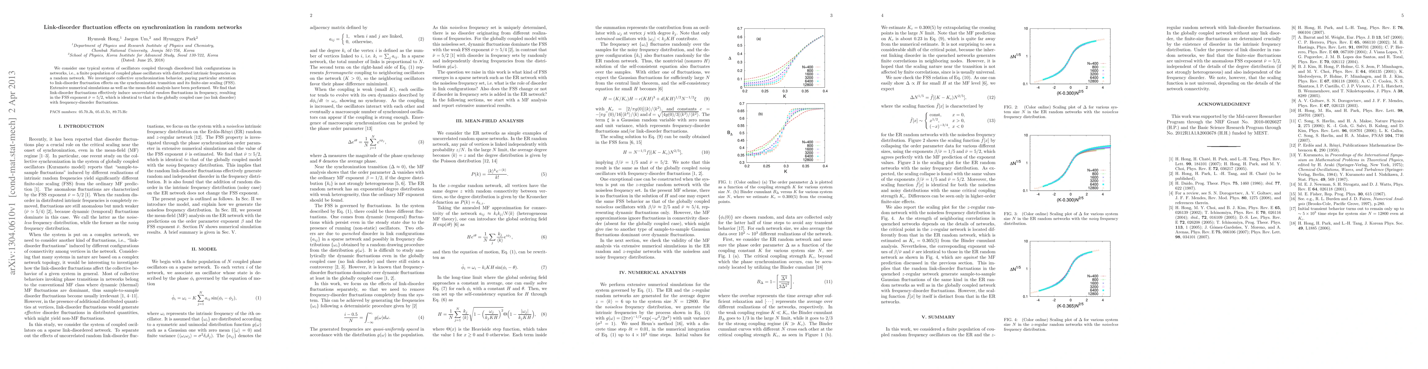 We consider one typical system of oscillators coupled through disordered link configurations in networks, i.e., a finite population of coupled phase oscillators with distributed intrinsic frequencies on a random network. We investigate collective synchronization behavior, paying particular attention to link-disorder fluctuation effects on the synchronization transition and its finite-size scaling (FSS). Extensive numerical simulations as well as the mean-field analysis have been performed. We find that link-disorder fluctuations effectively induce {\em uncorrelated random} fluctuations in frequency, resulting in the FSS exponent $\bar\nu=5/2$, which is identical to that in the globally coupled case (no link disorder) with frequency-disorder fluctuations.