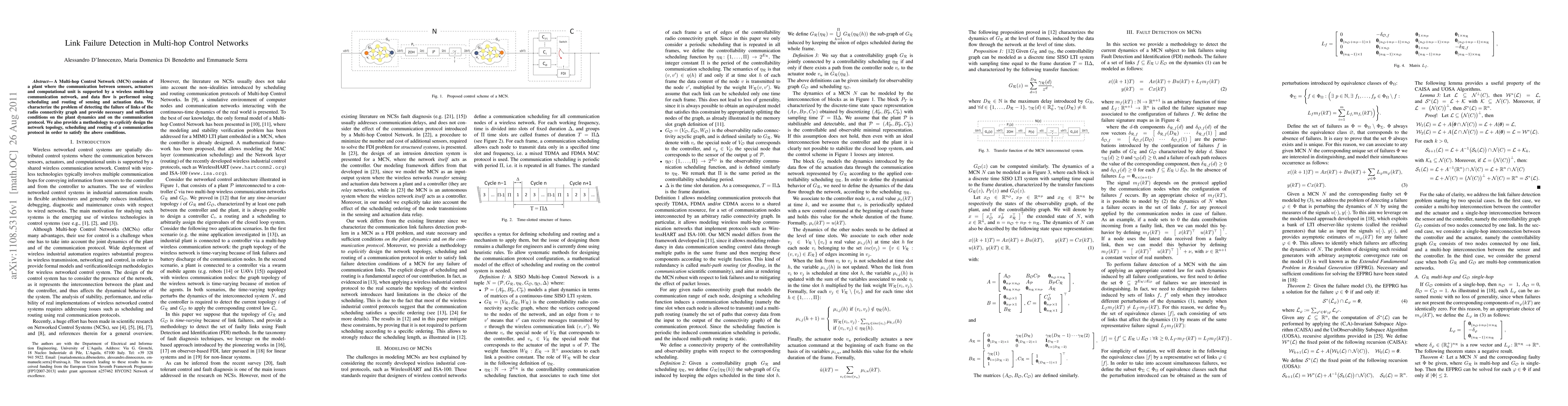 A Multi-hop Control Network (MCN) consists of a plant where the communication between sensors, actuators and computational unit is supported by a wireless multi-hop communication network, and data flow is performed using scheduling and routing of sensing and actuation data. We characterize the problem of detecting the failure of links of the radio connectivity graph and provide necessary and sufficient conditions on the plant dynamics and on the communication protocol. We also provide a methodology to \emph{explicitly} design the network topology, scheduling and routing of a communication protocol in order to satisfy the above conditions.