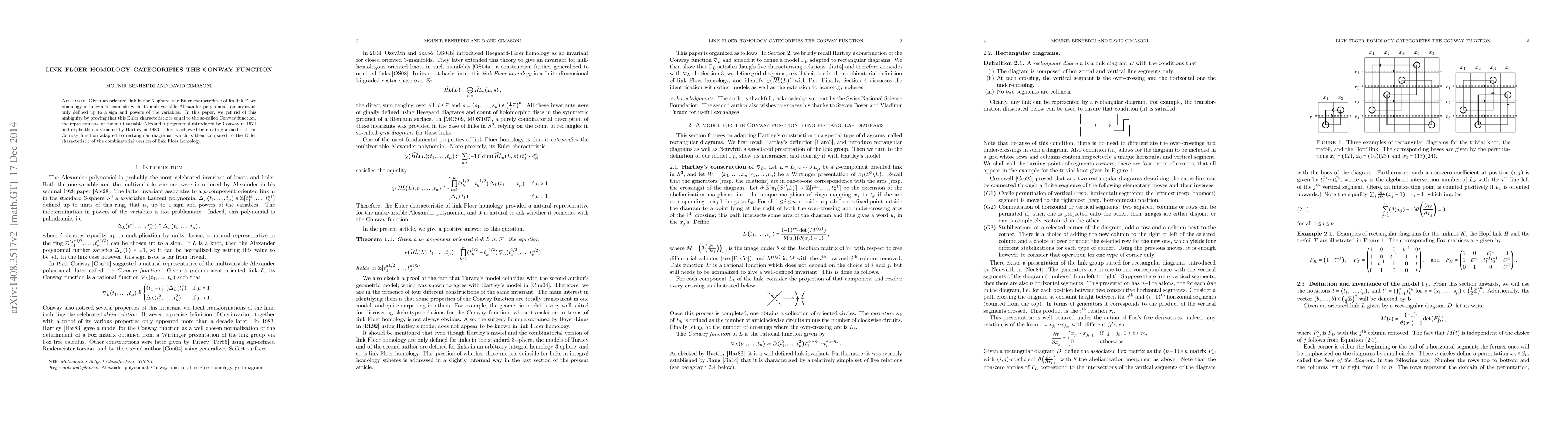 This paper demonstrates that the Euler characteristic of link Floer homology equals the Conway function, resolving the ambiguity in the multivariate Alexander polynomial. The authors achieve this by constructing a Conway function model for rectangular diagrams and comparing it to the combinatorial version of link Floer homology.