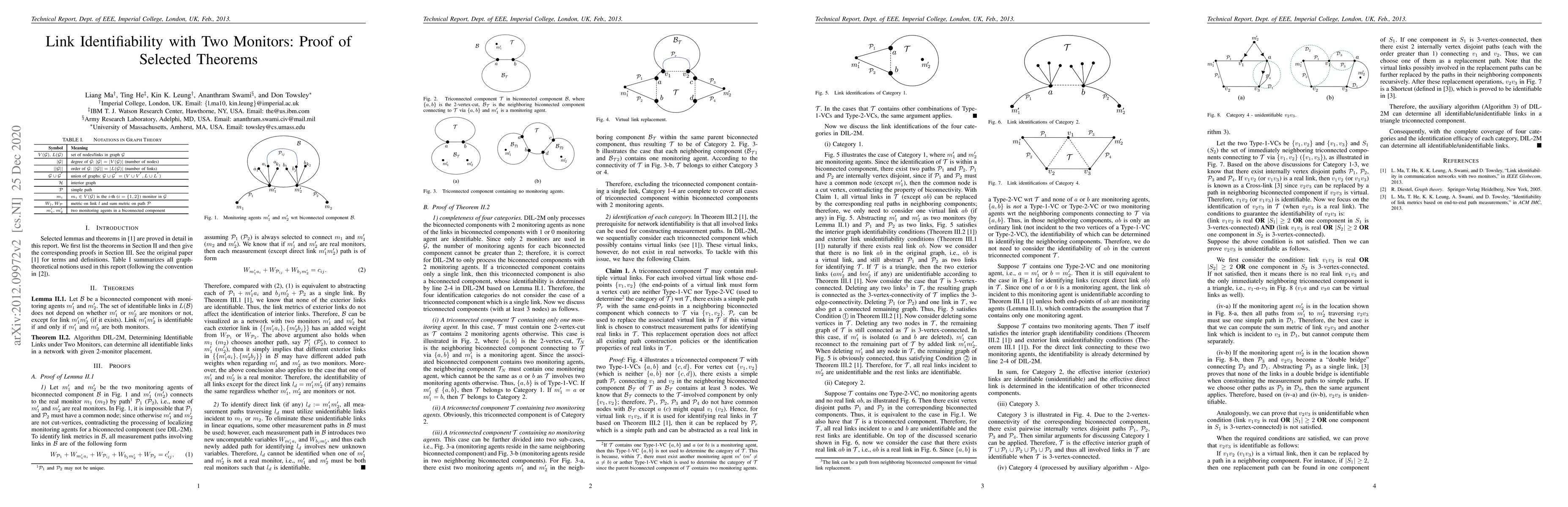 Summary: This technical report provides detailed proofs for theorems related to link identifiability in communication networks monitored by two devices, originally presented in a 2013 IEEE Globecom paper by Liang Ma et al. It serves as a comprehensive companion to the main publication.
