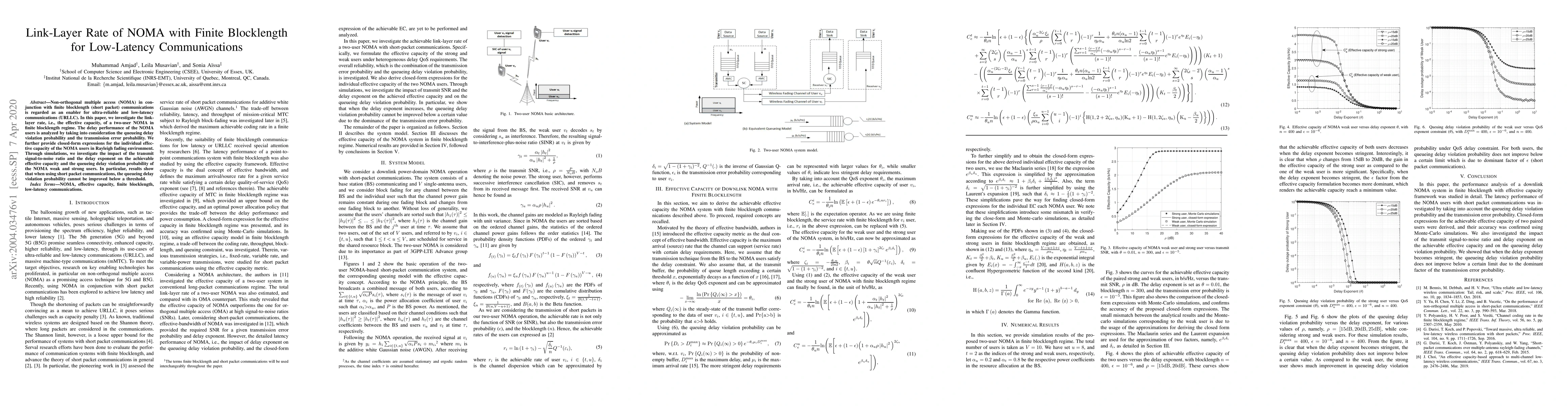 This paper investigates the link-layer rate of NOMA with finite blocklength for low-latency communications, providing closed-form expressions for effective capacity in Rayleigh fading. Simulation results show that short packet communications cannot reduce queueing delay violation probability below a threshold.