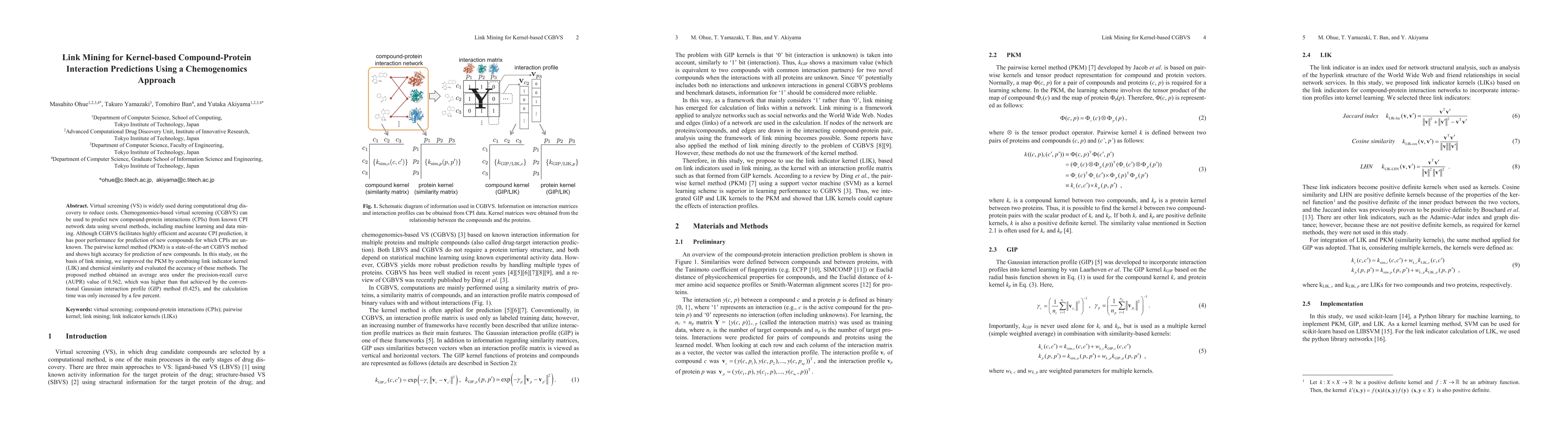 This paper proposes an enhanced pairwise kernel method (PKM) for predicting compound-protein interactions (CPIs) using link mining and a link indicator kernel (LIK). The improved method achieved a higher average area under the precision-recall curve (AUPR) of 0.562 compared to the conventional Gaussian interaction profile (GIP) method, with minimal increase in computational time.