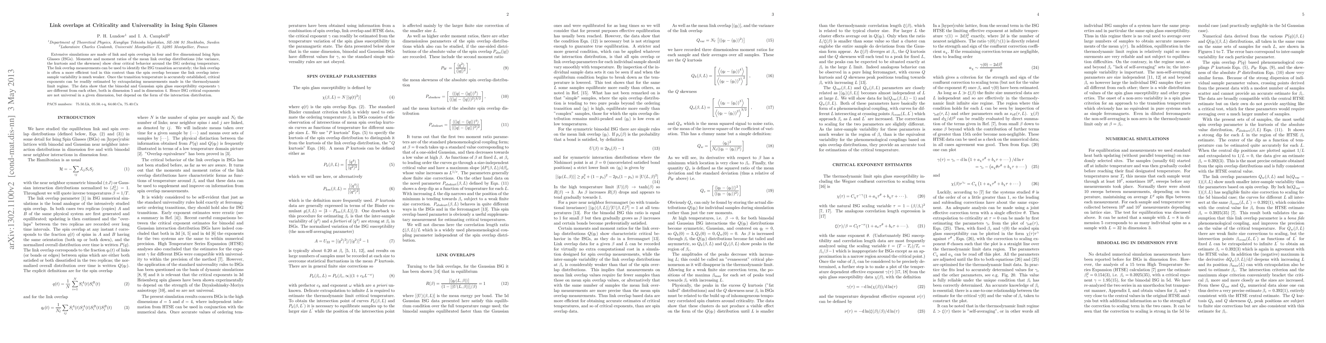This paper investigates link and spin overlaps in Ising Spin Glasses, revealing critical behavior around the ordering temperature through simulations. Link overlaps are shown to be a more precise indicator of the transition than spin overlaps due to lower inter-sample variability, allowing for accurate estimation of critical exponents. The study concludes that critical exponents in Ising Spin Glasses are not universal across dimensions and depend on the interaction distribution.