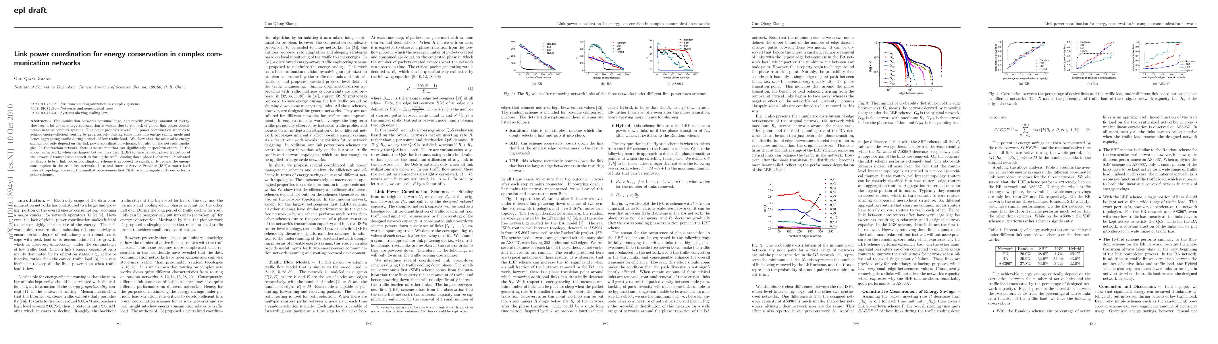 Communication networks consume huge, and rapidly growing, amount of energy. However, a lot of the energy consumption is wasted due to the lack of global link power coordination in these complex systems. This paper proposes several link power coordination schemes to achieve energy-efficient routing by progressively putting some links into energy saving mode and hence aggregating traffic during periods of low traffic load. We show that the achievable energy savings not only depend on the link power coordination schemes, but also on the network topologies. In the random network, there is no scheme that can significantly outperform others. In the scale-free network, when the largest betweenness first (LBF) scheme is used, phase transition of the networks' transmission capacities during the traffic cooling down phase is observed. Motivated by this, a hybrid link power coordination scheme is proposed to significantly reduce the energy consumption in the scale-free network. In a real Internet Service Provider (ISP)'s router-level Internet topology, however, the smallest betweenness first (SBF) scheme significantly outperforms other schemes.