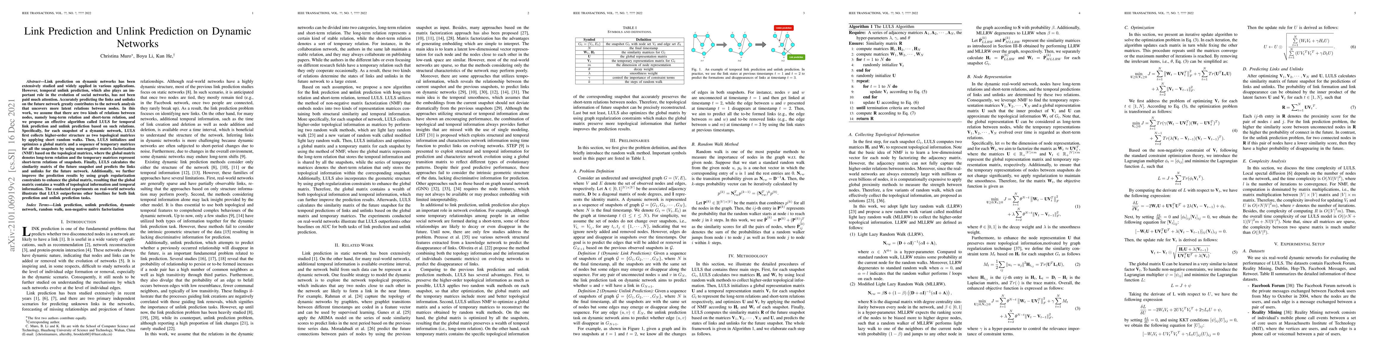 This paper proposes LULS, an algorithm for temporal link and unlink prediction on dynamic networks, distinguishing between long-term and short-term relations. LULS uses short random walks and non-negative matrix factorization to optimize matrices representing these relations, and graph regularization enhances prediction accuracy, outperforming baselines in experiments on real-world networks.