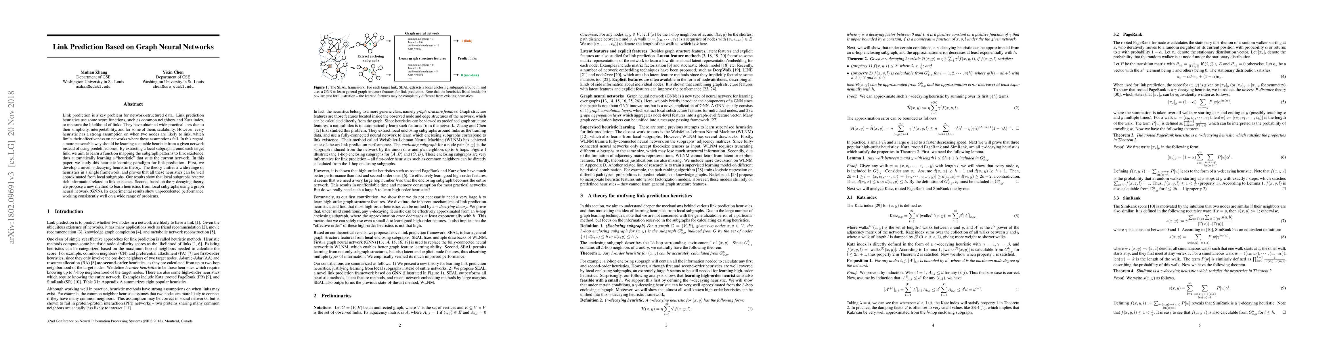 Link prediction is a key problem for network-structured data. Link prediction heuristics use some score functions, such as common neighbors and Katz index, to measure the likelihood of links. They have obtained wide practical uses due to their simplicity, interpretability, and for some of them, scalability. However, every heuristic has a strong assumption on when two nodes are likely to link, which limits their effectiveness on networks where these assumptions fail. In this regard, a more reasonable way should be learning a suitable heuristic from a given network instead of using predefined ones. By extracting a local subgraph around each target link, we aim to learn a function mapping the subgraph patterns to link existence, thus automatically learning a `heuristic' that suits the current network. In this paper, we study this heuristic learning paradigm for link prediction. First, we develop a novel $\gamma$-decaying heuristic theory. The theory unifies a wide range of heuristics in a single framework, and proves that all these heuristics can be well approximated from local subgraphs. Our results show that local subgraphs reserve rich information related to link existence. Second, based on the $\gamma$-decaying theory, we propose a new algorithm to learn heuristics from local subgraphs using a graph neural network (GNN). Its experimental results show unprecedented performance, working consistently well on a wide range of problems.