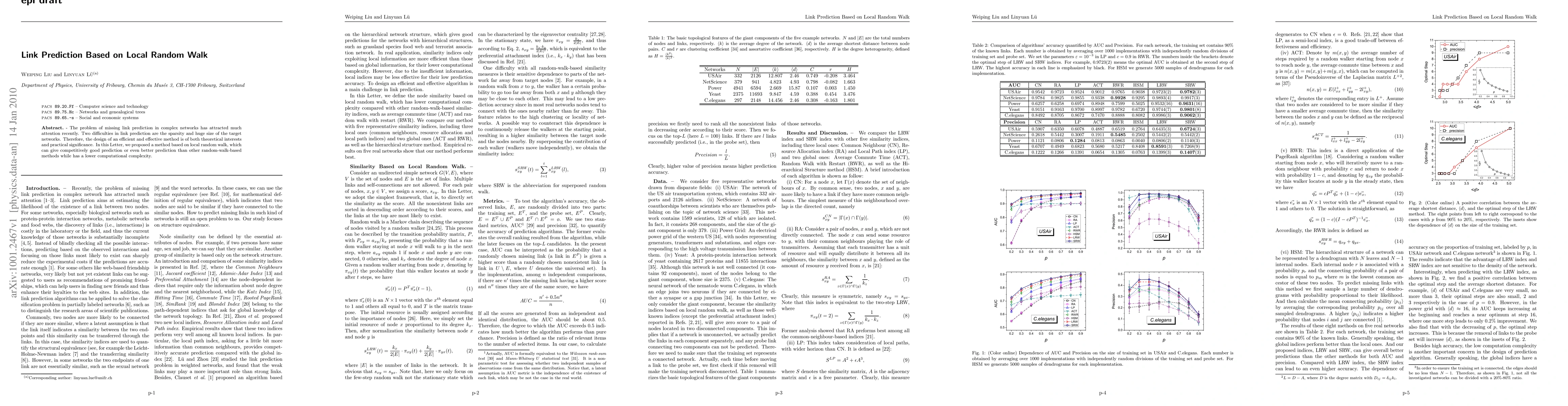 This paper proposes a local random walk-based method for predicting missing links in large, sparse networks, demonstrating competitive or superior performance compared to other random-walk methods with lower computational complexity.