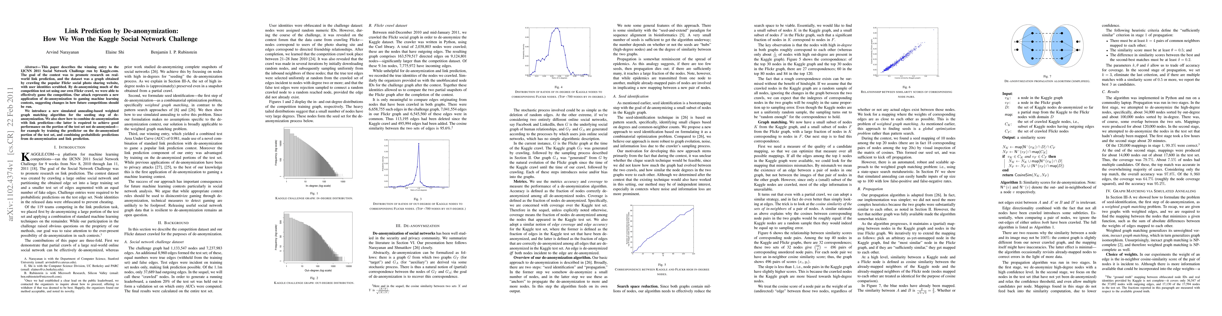 This paper details a winning strategy for the IJCNN 2011 Social Network Challenge by de-anonymizing a large portion of the test set using a self-conducted Flickr crawl. The authors propose a novel simulated annealing-based weighted graph matching algorithm and demonstrate how to integrate de-anonymization with link prediction to outperform the competition.