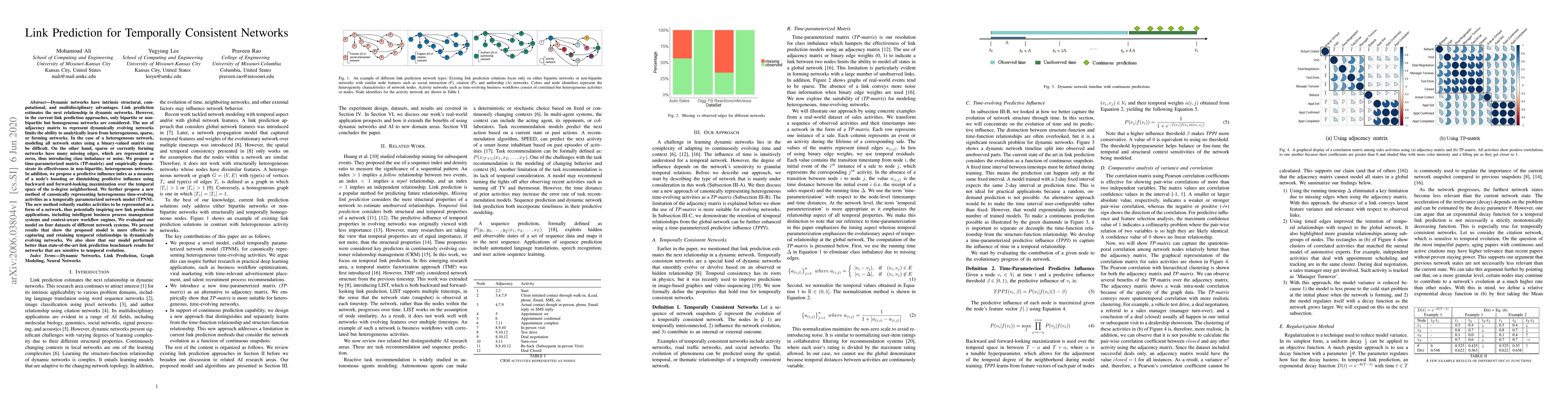 Dynamic networks have intrinsic structural, computational, and multidisciplinary advantages. Link prediction estimates the next relationship in dynamic networks. However, in the current link prediction approaches, only bipartite or non-bipartite but homogeneous networks are considered. The use of adjacency matrix to represent dynamically evolving networks limits the ability to analytically learn from heterogeneous, sparse, or forming networks. In the case of a heterogeneous network, modeling all network states using a binary-valued matrix can be difficult. On the other hand, sparse or currently forming networks have many missing edges, which are represented as zeros, thus introducing class imbalance or noise. We propose a time-parameterized matrix (TP-matrix) and empirically demonstrate its effectiveness in non-bipartite, heterogeneous networks. In addition, we propose a predictive influence index as a measure of a node's boosting or diminishing predictive influence using backward and forward-looking maximization over the temporal space of the n-degree neighborhood. We further propose a new method of canonically representing heterogeneous time-evolving activities as a temporally parameterized network model (TPNM). The new method robustly enables activities to be represented as a form of a network, thus potentially inspiring new link prediction applications, including intelligent business process management systems and context-aware workflow engines. We evaluated our model on four datasets of different network systems. We present results that show the proposed model is more effective in capturing and retaining temporal relationships in dynamically evolving networks. We also show that our model performed better than state-of-the-art link prediction benchmark results for networks that are sensitive to temporal evolution.