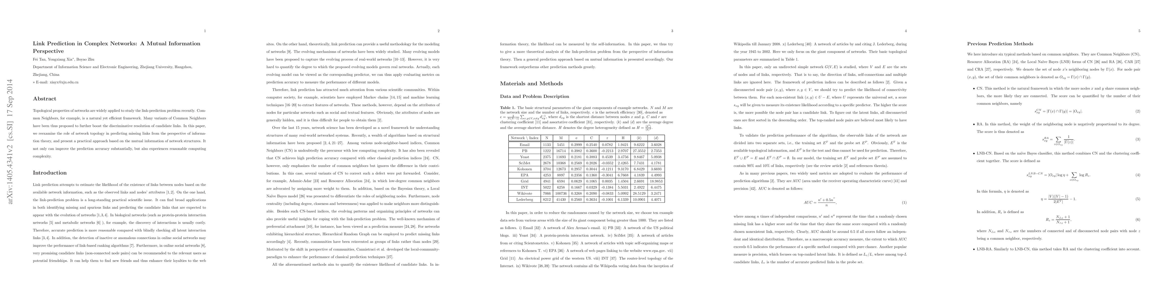 This paper proposes a novel link prediction method based on mutual information from an information theory perspective, aiming to improve the accuracy of predicting missing links in complex networks while maintaining reasonable computational complexity.