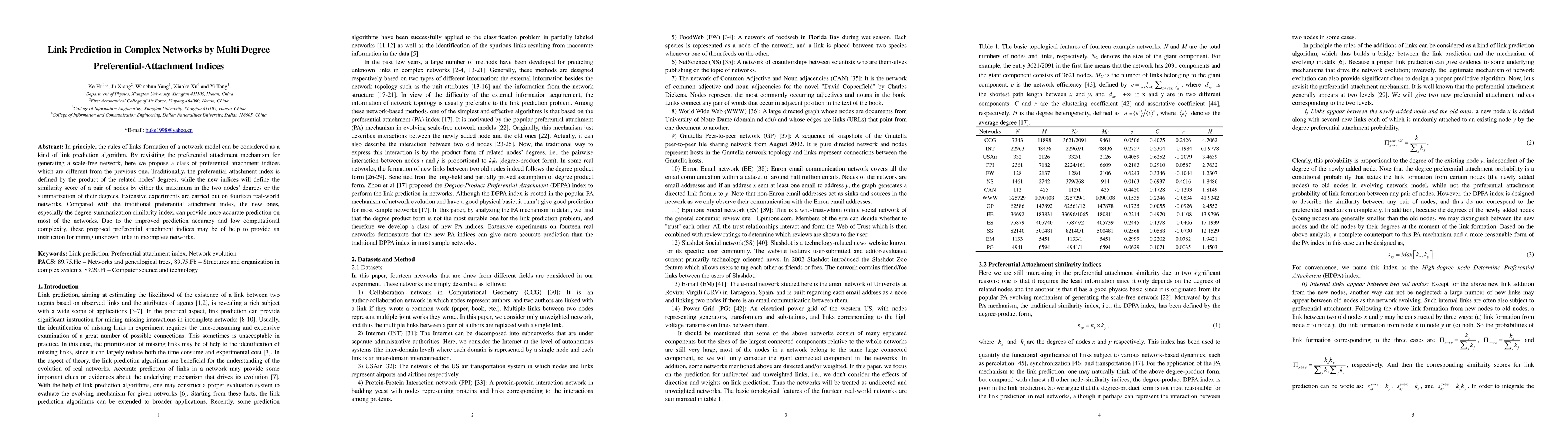 This paper proposes new preferential attachment indices for link prediction in complex networks, differing from traditional methods by using either the maximum or summarization of nodes' degrees. Experiments on fourteen real-world networks show that these new indices, especially the degree-summarization index, provide more accurate link predictions with lower computational complexity.