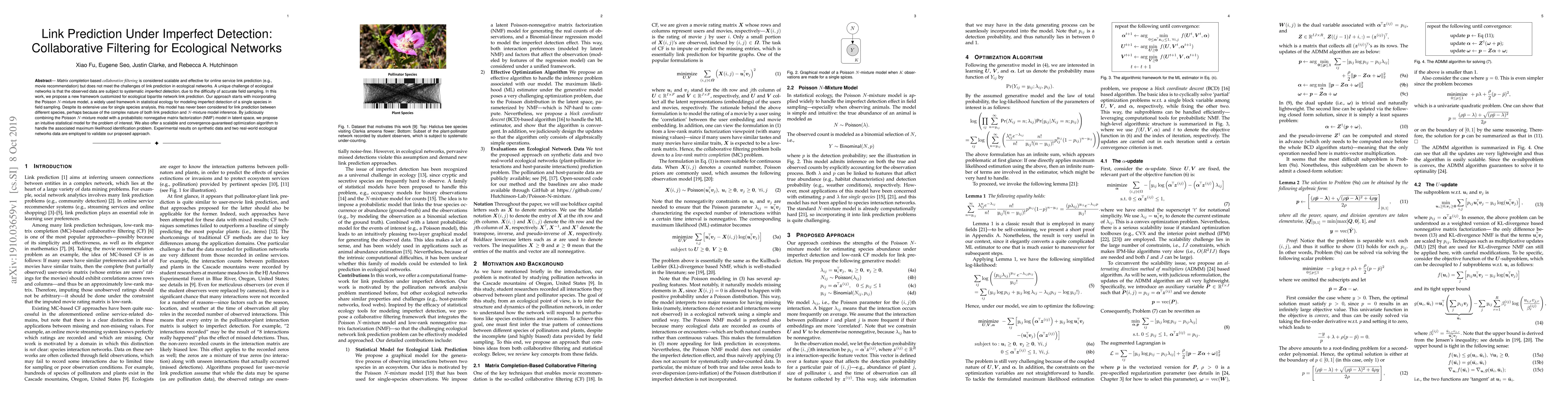 Matrix completion based collaborative filtering is considered scalable and effective for online service link prediction (e.g., movie recommendation) but does not meet the challenges of link prediction in ecological networks. A unique challenge of ecological networks is that the observed data are subject to systematic imperfect detection, due to the difficulty of accurate field sampling. In this work, we propose a new framework customized for ecological bipartite network link prediction. Our approach starts with incorporating the Poisson N-mixture model, a widely used framework in statistical ecology for modeling imperfect detection of a single species in field sampling. Despite its extensive use for single species analysis, this model has never been considered for link prediction between different species, perhaps because of the complex nature of both link prediction and N-mixture model inference. By judiciously combining the Poisson N-mixture model with a probabilistic nonnegative matrix factorization (NMF) model in latent space, we propose an intuitive statistical model for the problem of interest. We also offer a scalable and convergence-guaranteed optimization algorithm to handle the associated maximum likelihood identification problem. Experimental results on synthetic data and two real-world ecological networks data are employed to validate our proposed approach.
