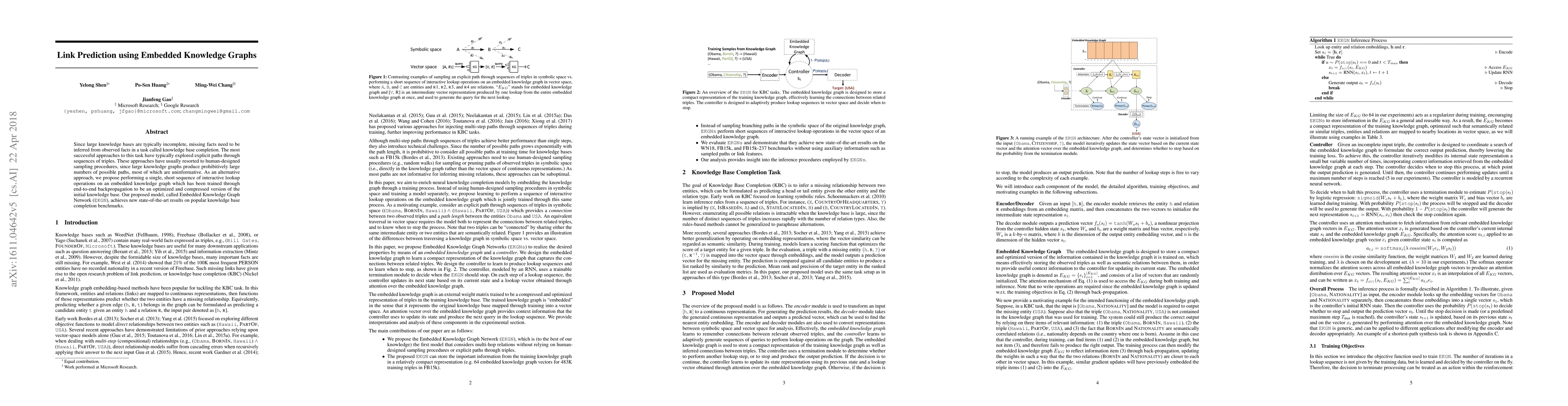 Since large knowledge bases are typically incomplete, missing facts need to be inferred from observed facts in a task called knowledge base completion. The most successful approaches to this task have typically explored explicit paths through sequences of triples. These approaches have usually resorted to human-designed sampling procedures, since large knowledge graphs produce prohibitively large numbers of possible paths, most of which are uninformative. As an alternative approach, we propose performing a single, short sequence of interactive lookup operations on an embedded knowledge graph which has been trained through end-to-end backpropagation to be an optimized and compressed version of the initial knowledge base. Our proposed model, called Embedded Knowledge Graph Network (EKGN), achieves new state-of-the-art results on popular knowledge base completion benchmarks.