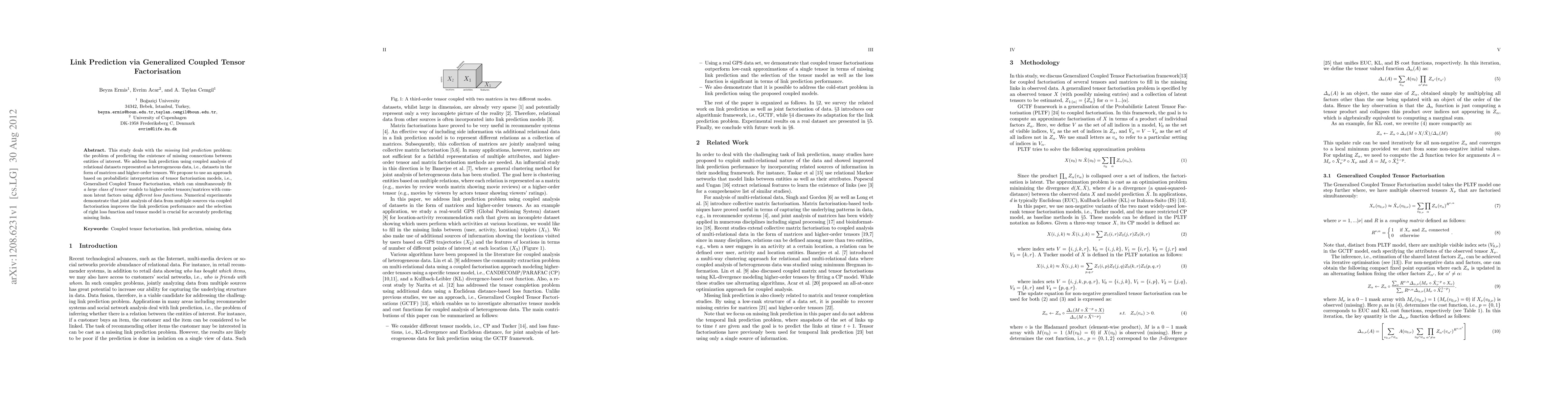 This paper proposes a Generalized Coupled Tensor Factorisation method for predicting missing links in relational datasets represented as matrices and tensors. The approach uses probabilistic tensor factorisation to fit various tensor models, improving link prediction performance when using coupled analysis of multiple data sources.