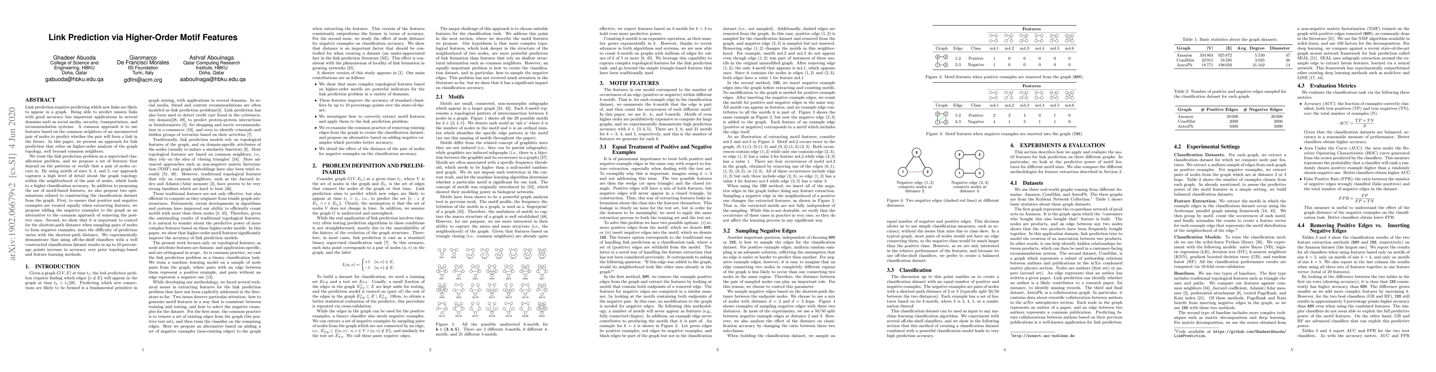 Link prediction requires predicting which new links are likely to appear in a graph. Being able to predict unseen links with good accuracy has important applications in several domains such as social media, security, transportation, and recommendation systems. A common approach is to use features based on the common neighbors of an unconnected pair of nodes to predict whether the pair will form a link in the future. In this paper, we present an approach for link prediction that relies on higher-order analysis of the graph topology, well beyond common neighbors. We treat the link prediction problem as a supervised classification problem, and we propose a set of features that depend on the patterns or motifs that a pair of nodes occurs in. By using motifs of sizes 3, 4, and 5, our approach captures a high level of detail about the graph topology within the neighborhood of the pair of nodes, which leads to a higher classification accuracy. In addition to proposing the use of motif-based features, we also propose two optimizations related to constructing the classification dataset from the graph. First, to ensure that positive and negative examples are treated equally when extracting features, we propose adding the negative examples to the graph as an alternative to the common approach of removing the positive ones. Second, we show that it is important to control for the shortest-path distance when sampling pairs of nodes to form negative examples, since the difficulty of prediction varies with the shortest-path distance. We experimentally demonstrate that using off-the-shelf classifiers with a well constructed classification dataset results in up to 10 percentage points increase in accuracy over prior topology-based and feature learning methods.