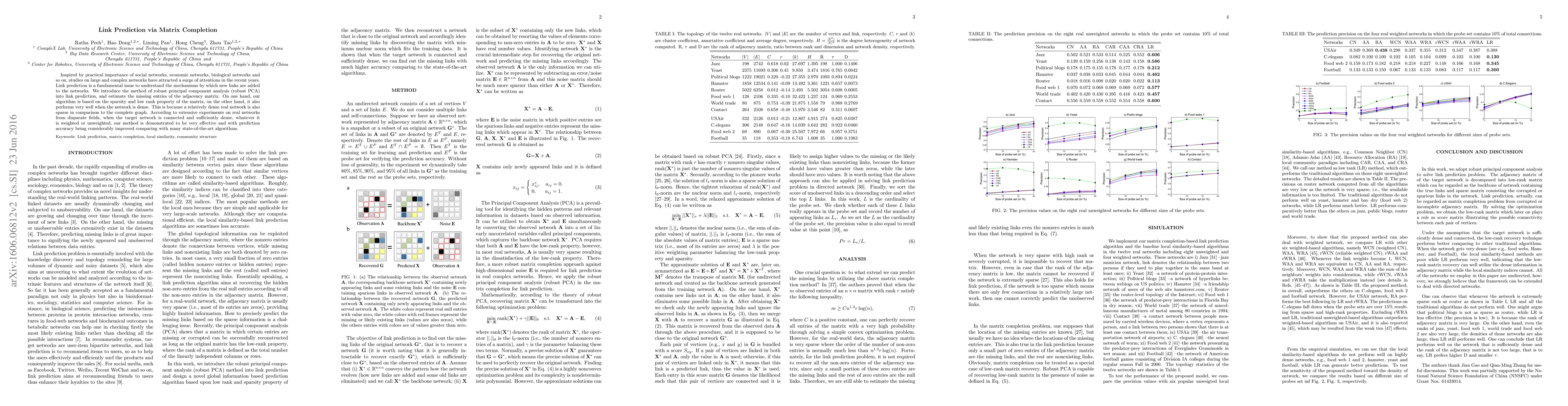 This research paper introduces a method for link prediction in large networks using robust principal component analysis (robust PCA) to estimate missing entries in the adjacency matrix. The method leverages the sparsity and low-rank properties of the matrix and shows significant improvement in prediction accuracy over state-of-the-art algorithms, particularly in dense networks.