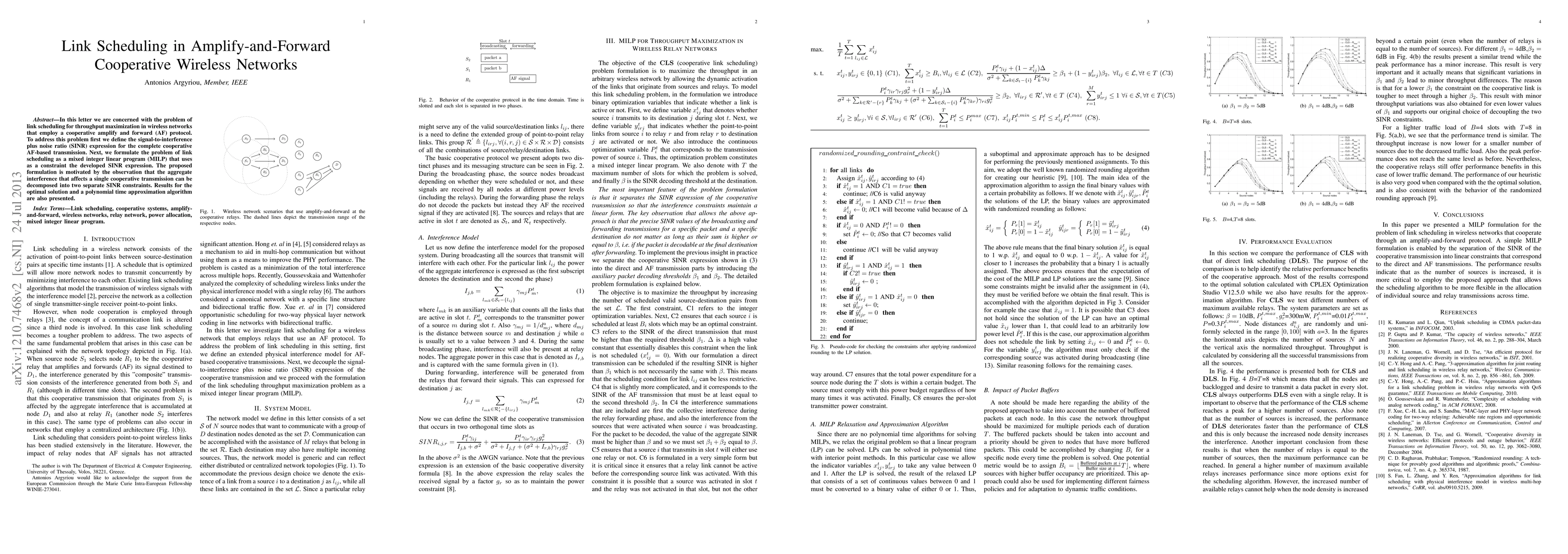 This paper addresses link scheduling for maximizing throughput in cooperative amplify-and-forward wireless networks. It formulates the problem as a mixed integer linear program using a defined SINR expression, and presents both an optimal solution and a polynomial time approximation algorithm.