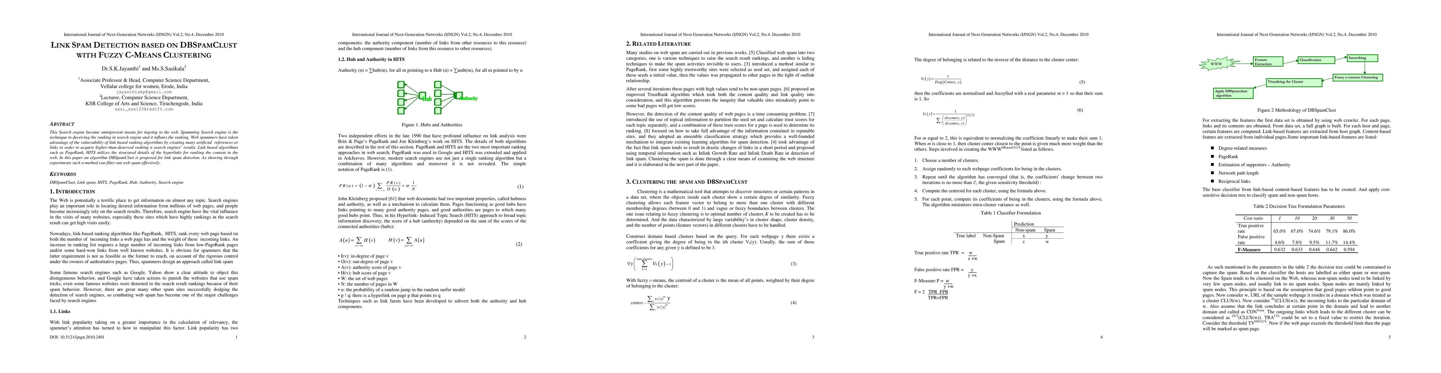 Search engine became omnipresent means for ingoing to the web. Spamming Search engine is the technique to deceiving the ranking in search engine and it inflates the ranking. Web spammers have taken advantage of the vulnerability of link based ranking algorithms by creating many artificial references or links in order to acquire higher-than-deserved ranking n search engines' results. Link based algorithms such as PageRank, HITS utilizes the structural details of the hyperlinks for ranking the content in the web. In this paper an algorithm DBSpamClust is proposed for link spam detection. As showing through experiments such a method can filter out web spam effectively
