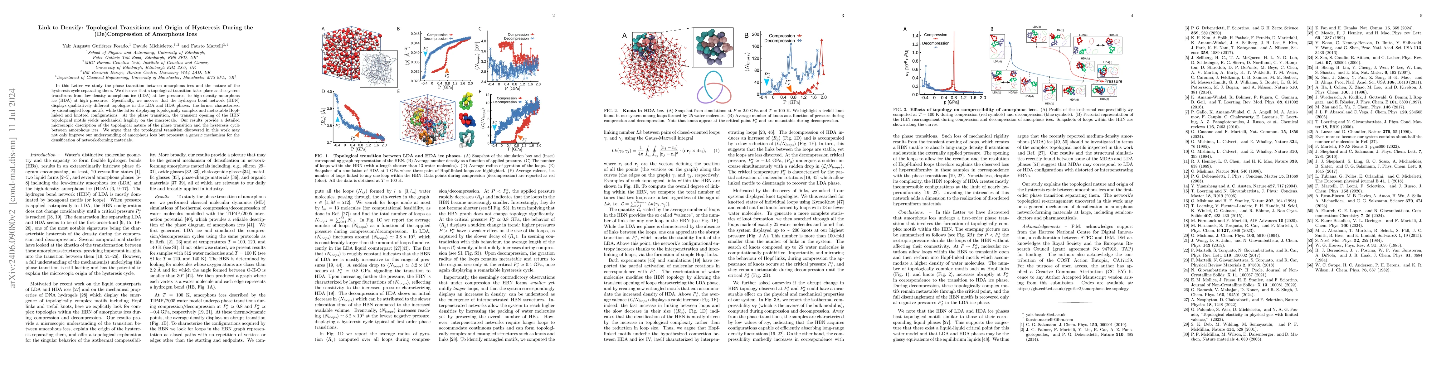 This research reveals that applying pressure to low-density amorphous ice (LDA) induces a topological transition in its hydrogen bond network (HBN), transforming it into high-density amorphous ice (HDA) with interpenetrated motifs. This transition lowers mechanical rigidity and significantly enhances compressibility, suggesting topological changes as a general mechanism for densifying amorphous materials.