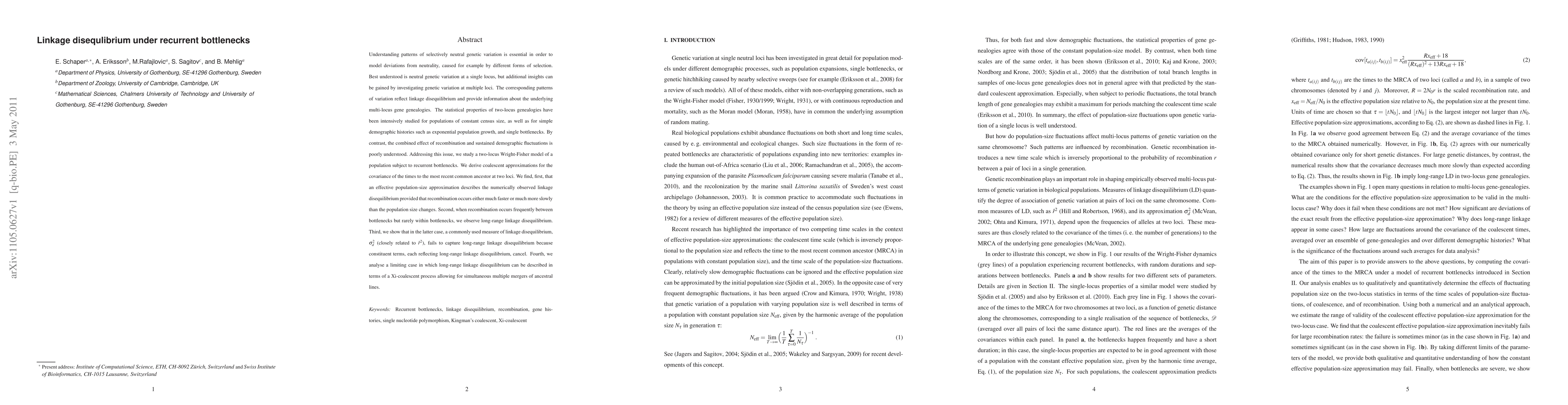 This paper investigates linkage disequilibrium patterns in a two-locus Wright-Fisher model under recurrent population bottlenecks. It reveals that effective population size approximations hold under specific recombination conditions, identifies long-range linkage disequilibrium when recombination is frequent between bottlenecks, and shows that traditional measures may fail to capture such disequilibrium due to cancellation effects.