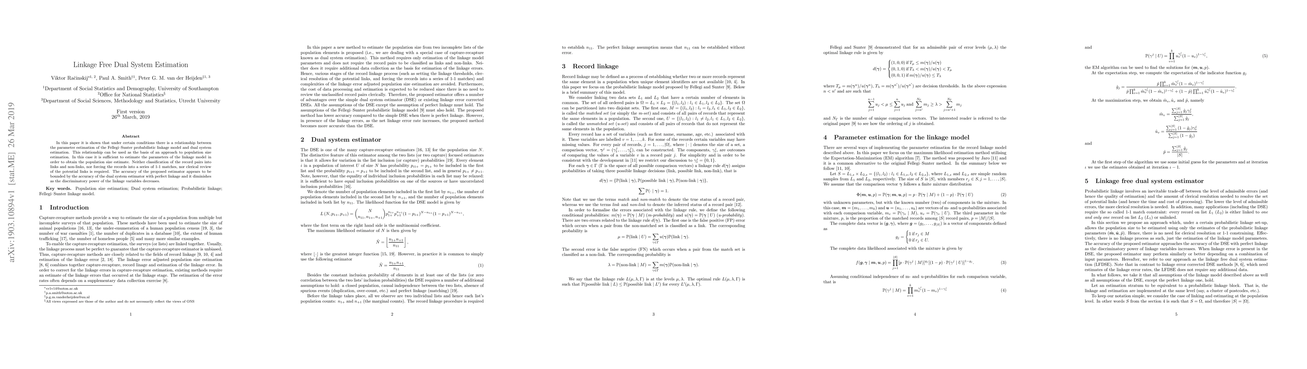 In this paper it is shown that under certain conditions there is a relationship between the parameter estimation of the Fellegi--Sunter probabilistic linkage model and dual system estimation. This relationship can be used as the basis of an approach to population size estimation. In this case it is sufficient to estimate the parameters of the linkage model in order to obtain the population size estimate. Neither classification of the record pairs into links and non-links, nor forcing the records into a series of 1-1 matches, nor clerical review of the potential links is required. The accuracy of the proposed estimator appears to be bounded by the accuracy of the dual system estimator with perfect linkage and it diminishes as the discriminatory power of the linkage variables decreases.