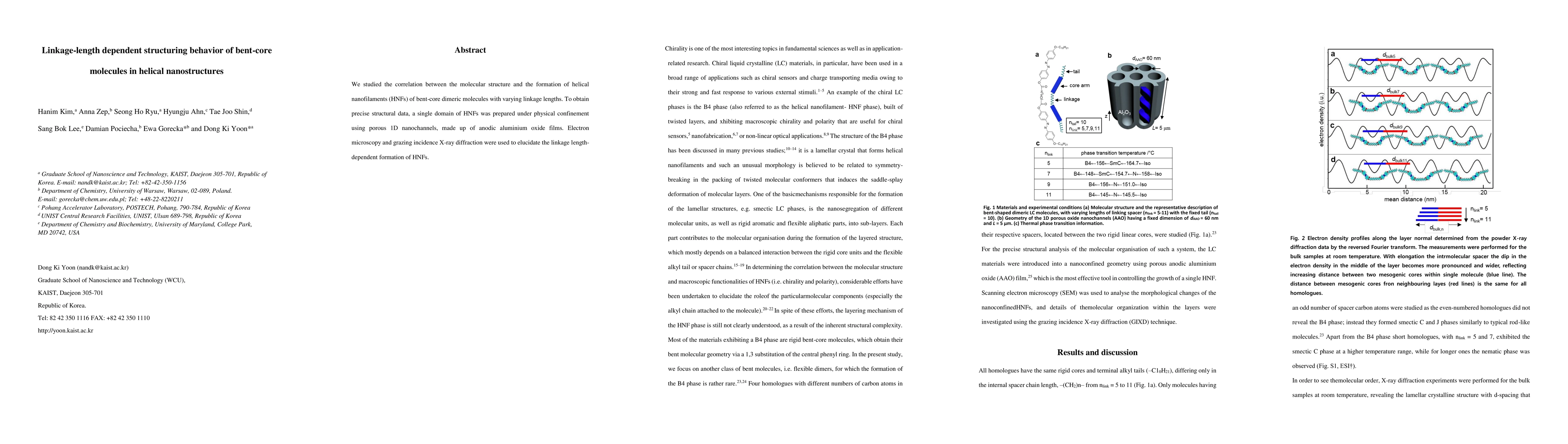 We studied the correlation between the molecular structure and the formation of helical nanofilaments (HNFs) of bent-core dimeric molecules with varying linkage lengths. To obtain precise structural data, a single domain of HNFs was prepared under physical confinement using porous 1D nanochannels, made up of anodic aluminium oxide films. Electron microscopy and grazing incidence X-ray diffraction were used to elucidate the linkage length-dependent formation of HNFs.