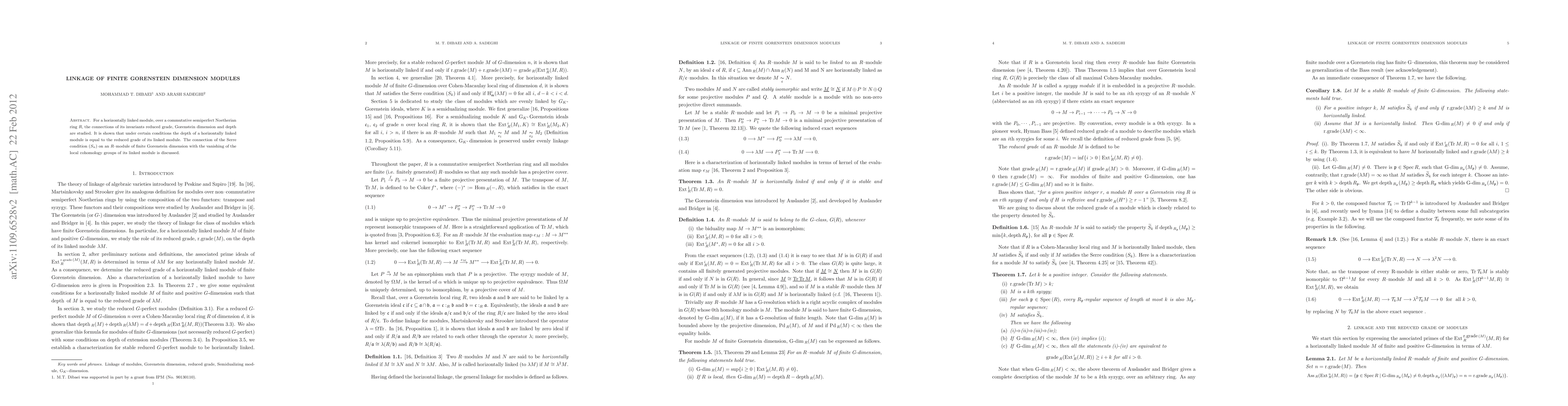For a horizontally linked module, over a commutative semiperfect Noetherian ring $R$, the connections of its invariants reduced grade, Gorenstein dimension and depth are studied. It is shown that under certain conditions the depth of a horizontally linked module is equal to the reduced grade of its linked module. The connection of the Serre condition $(S_n)$ on an $R$--module of finite Gorenstein dimension with the vanishing of the local cohomology groups of its linked module is discussed.