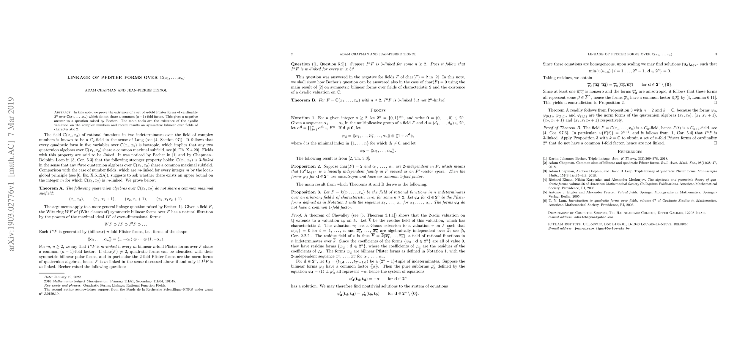 Summary: The paper establishes a set of $2^n$ $n$-fold Pfister forms over $\mathbb{C}(x_1,\ldots,x_n)$ that lack a common $(n-1)$-fold factor, answering Becher's question negatively. The study leverages the dyadic valuation on complex numbers and recent findings on symmetric bilinear forms in characteristic 2.