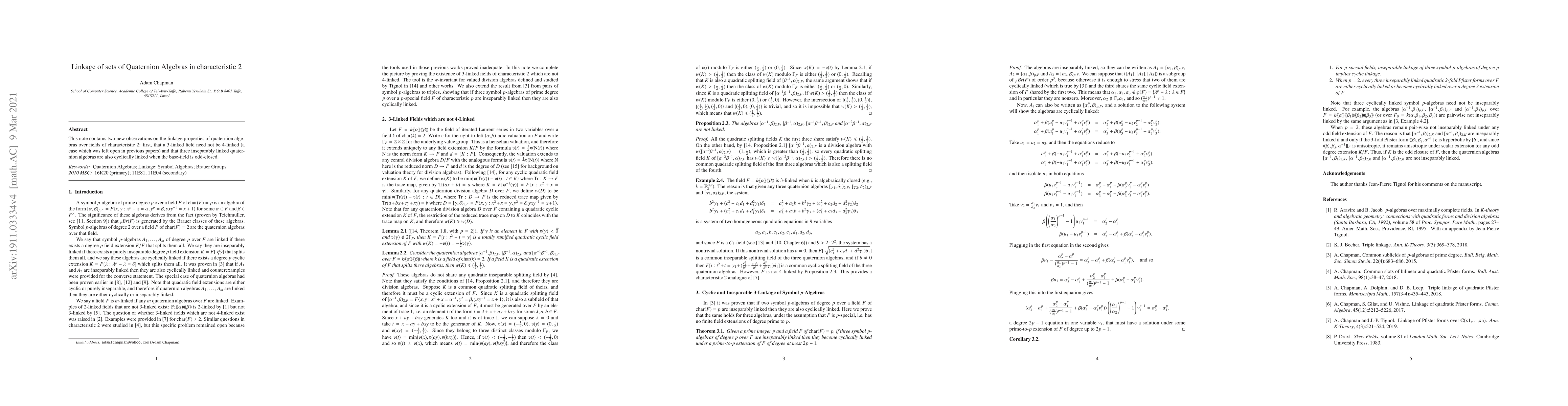 This note contains two new observations on the linkage properties of quaternion algebras over fields of characteristic 2: first, that a 3-linked field need not be 4-linked (a case which was left open in previous papers) and that three inseparably linked quaternion algebras are also cyclically linked when the base-field is odd-closed.