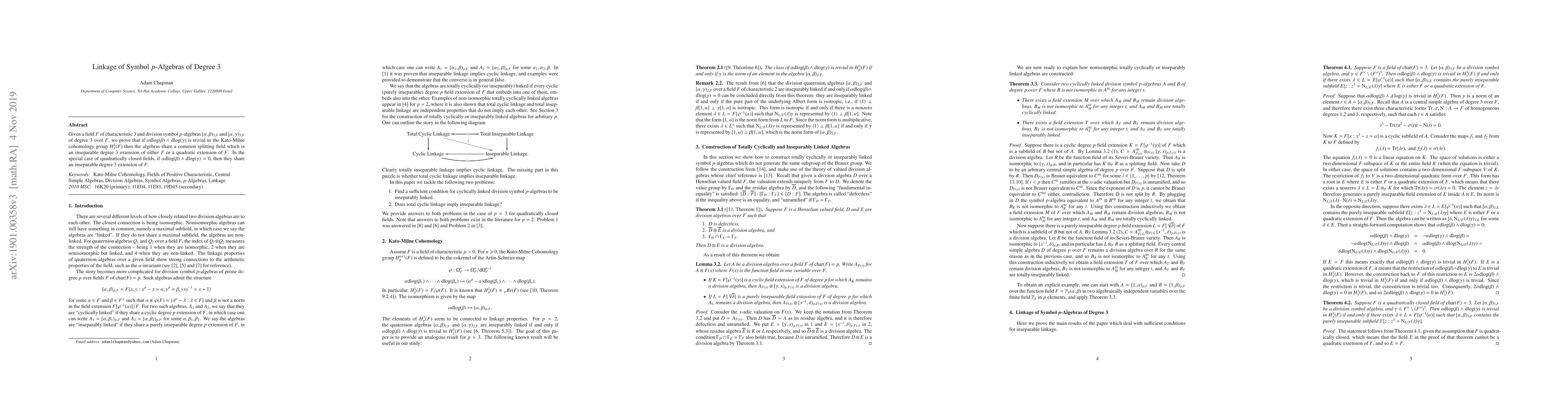 Research proves that two degree 3 $p$-algebras share a common splitting field if their Kato-Milne cohomology group is trivial, with implications for inseparable extensions of fields.
