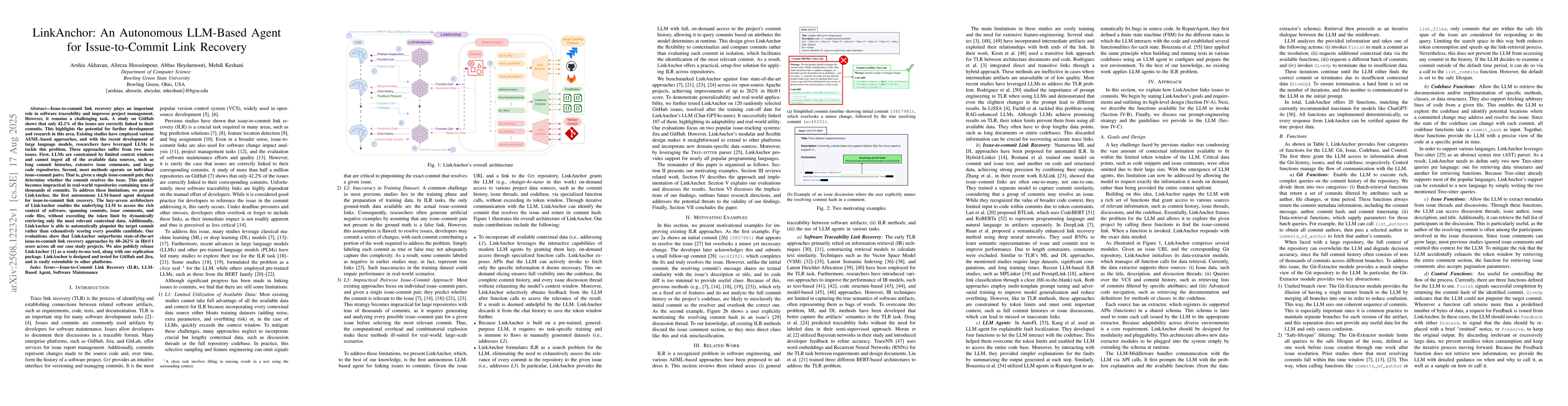 Issue-to-commit link recovery plays an important role in software traceability and improves project management. However, it remains a challenging task. A study on GitHub shows that only 42.2% of the issues are correctly linked to their commits. This highlights the potential for further development and research in this area. Existing studies have employed various AI/ML-based approaches, and with the recent development of large language models, researchers have leveraged LLMs to tackle this problem. These approaches suffer from two main issues. First, LLMs are constrained by limited context windows and cannot ingest all of the available data sources, such as long commit histories, extensive issue comments, and large code repositories. Second, most methods operate on individual issue-commit pairs; that is, given a single issue-commit pair, they determine whether the commit resolves the issue. This quickly becomes impractical in real-world repositories containing tens of thousands of commits. To address these limitations, we present LinkAnchor, the first autonomous LLM-based agent designed for issue-to-commit link recovery. The lazy-access architecture of LinkAnchor enables the underlying LLM to access the rich context of software, spanning commits, issue comments, and code files, without exceeding the token limit by dynamically retrieving only the most relevant contextual data. Additionally, LinkAnchor is able to automatically pinpoint the target commit rather than exhaustively scoring every possible candidate. Our evaluations show that LinkAnchor outperforms state-of-the-art issue-to-commit link recovery approaches by 60-262% in Hit@1 score across all our case study projects. We also publicly release LinkAnchor as a ready-to-use tool, along with our replication package. LinkAnchor is designed and tested for GitHub and Jira, and is easily extendable to other platforms.