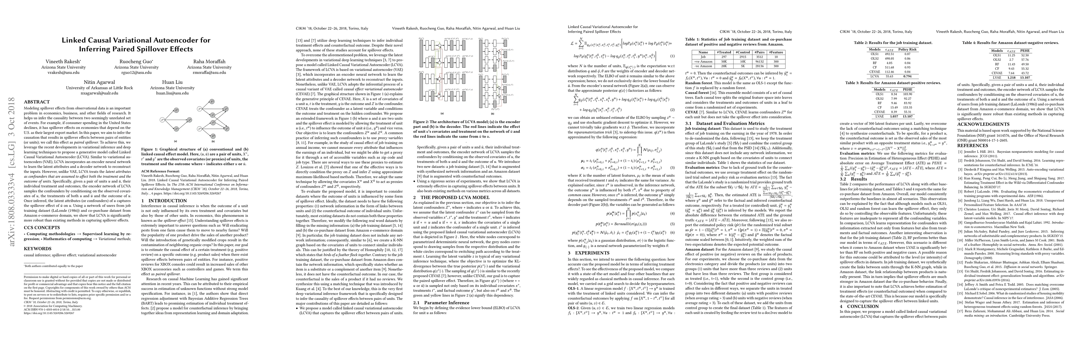Modeling spillover effects from observational data is an important problem in economics, business, and other fields of research. % It helps us infer the causality between two seemingly unrelated set of events. For example, if consumer spending in the United States declines, it has spillover effects on economies that depend on the U.S. as their largest export market. In this paper, we aim to infer the causation that results in spillover effects between pairs of entities (or units), we call this effect as \textit{paired spillover}. To achieve this, we leverage the recent developments in variational inference and deep learning techniques to propose a generative model called Linked Causal Variational Autoencoder (LCVA). Similar to variational autoencoders (VAE), LCVA incorporates an encoder neural network to learn the latent attributes and a decoder network to reconstruct the inputs. However, unlike VAE, LCVA treats the \textit{latent attributes as confounders that are assumed to affect both the treatment and the outcome of units}. Specifically, given a pair of units $u$ and $\bar{u}$, their individual treatment and outcomes, the encoder network of LCVA samples the confounders by conditioning on the observed covariates of $u$, the treatments of both $u$ and $\bar{u}$ and the outcome of $u$. Once inferred, the latent attributes (or confounders) of $u$ captures the spillover effect of $\bar{u}$ on $u$. Using a network of users from job training dataset (LaLonde (1986)) and co-purchase dataset from Amazon e-commerce domain, we show that LCVA is significantly more robust than existing methods in capturing spillover effects.