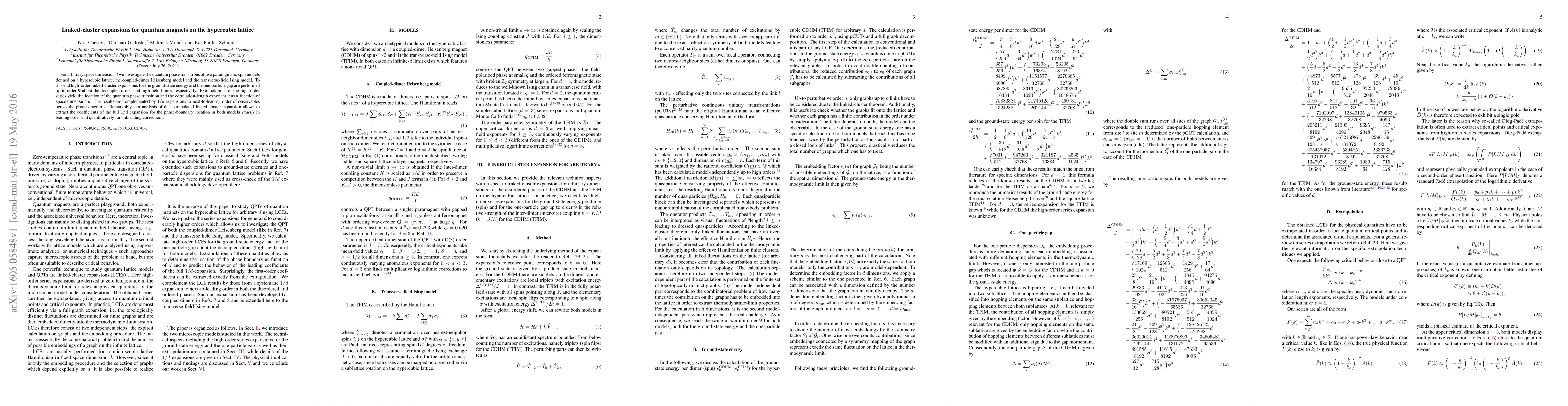For arbitrary space dimension $d$ we investigate the quantum phase transitions of two paradigmatic spin models defined on a hypercubic lattice, the coupled-dimer Heisenberg model and the transverse-field Ising model. To this end high-order linked-cluster expansions for the ground-state energy and the one-particle gap are performed up to order 9 about the decoupled-dimer and high-field limits, respectively. Extrapolations of the high-order series yield the location of the quantum phase transition and the correlation-length exponent $\nu$ as a function of space dimension $d$. The results are complemented by $1/d$ expansions to next-to-leading order of observables across the phase diagrams. Remarkably, our analysis of the extrapolated linked-cluster expansion allows to extract the coefficients of the full $1/d$ expansion for the phase-boundary location in both models exactly in leading order and quantitatively for subleading corrections.