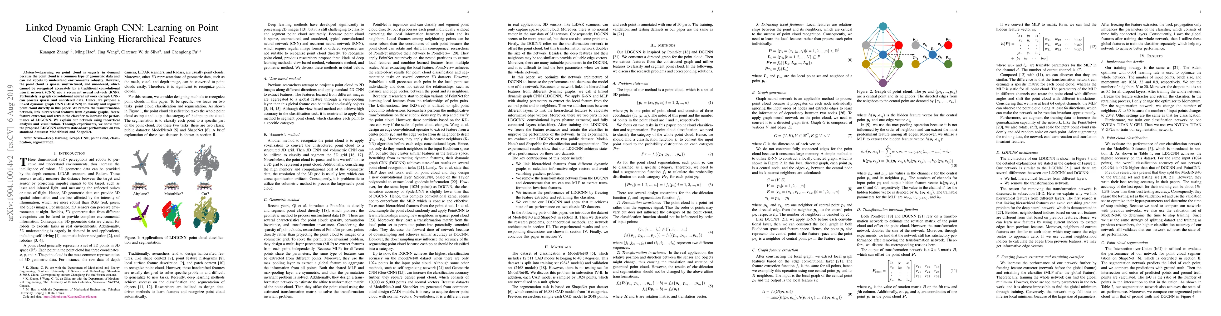 This research introduces a linked dynamic graph convolutional neural network (LDGCNN) for processing and classifying point clouds, which are a common form of geometric data. The proposed method enhances performance by linking hierarchical features from dynamic graphs and retrains the classifier, achieving state-of-the-art results on ModelNet40 and ShapeNet datasets. For more details, please refer to the original paper.