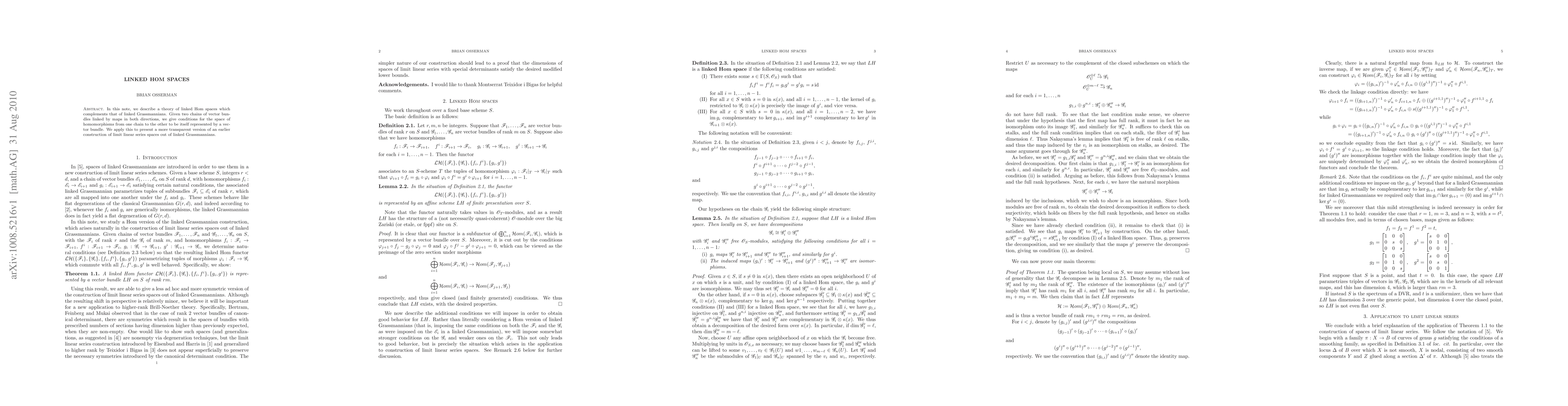 This paper develops a theory of linked Hom spaces, providing conditions for the space of homomorphisms between two linked chains of vector bundles to be represented by a vector bundle. It applies this theory to clarify an earlier construction of limit linear series spaces using linked Grassmannians.