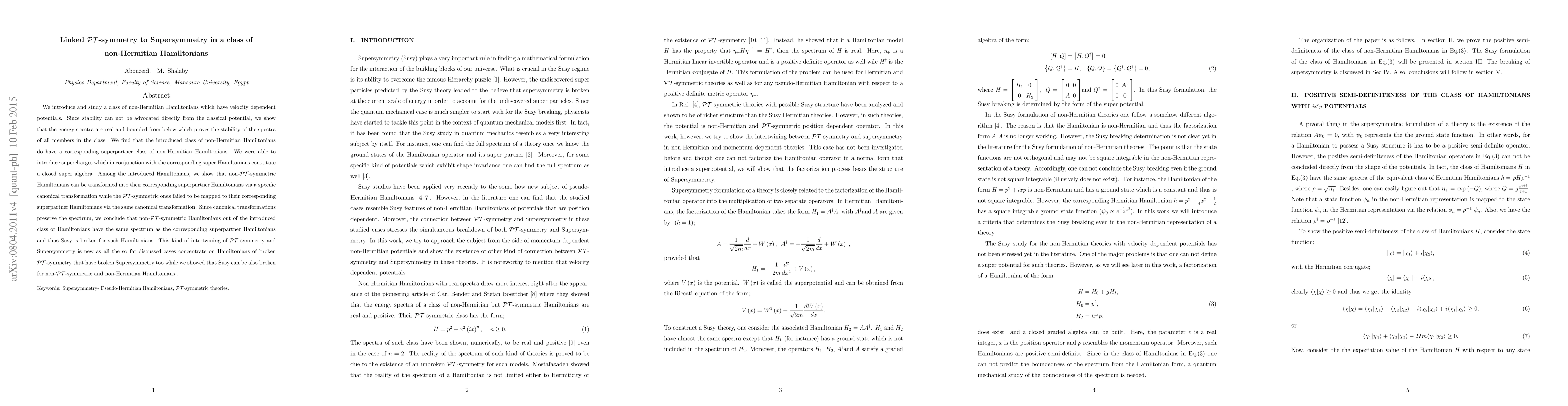 The paper explores a novel class of non-Hermitian Hamiltonians with velocity-dependent potentials and demonstrates that their energy spectra are real and stable. It reveals a link between $\mathcal{PT}$-symmetry and supersymmetry in these Hamiltonians, showing that non-$\mathcal{PT}$-symmetric ones can transform into superpartners, while $\mathcal{PT}$-symmetric ones cannot, leading to broken supersymmetry for non-$\mathcal{PT}$-symmetric cases.