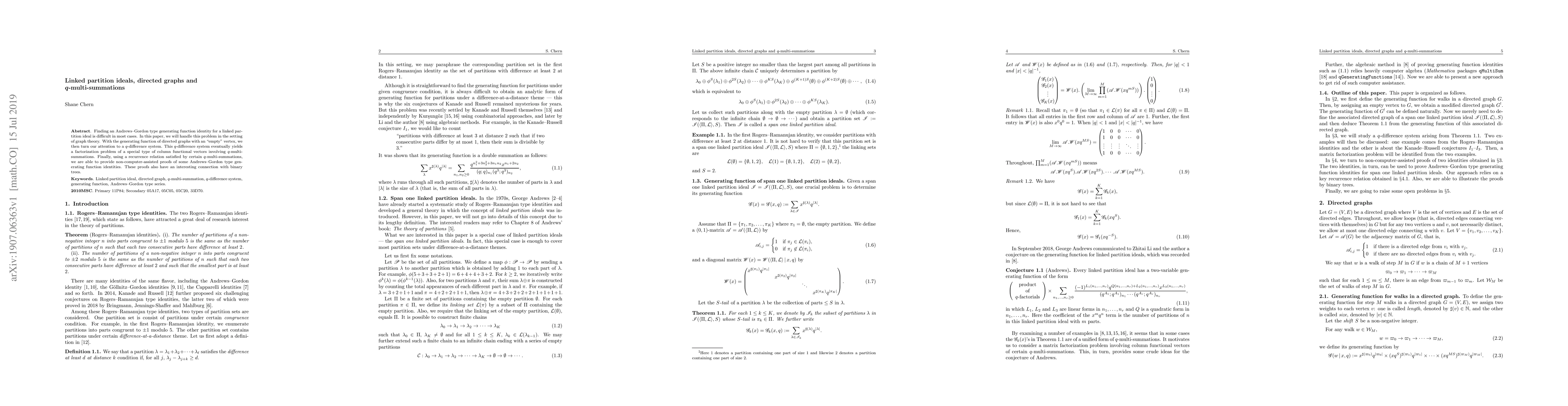 Researchers developed a method to find Andrews-Gordon type generating function identities for linked partition ideals using graph theory and $q$-multi-summations, providing non-computer-assisted proofs with connections to binary trees.
